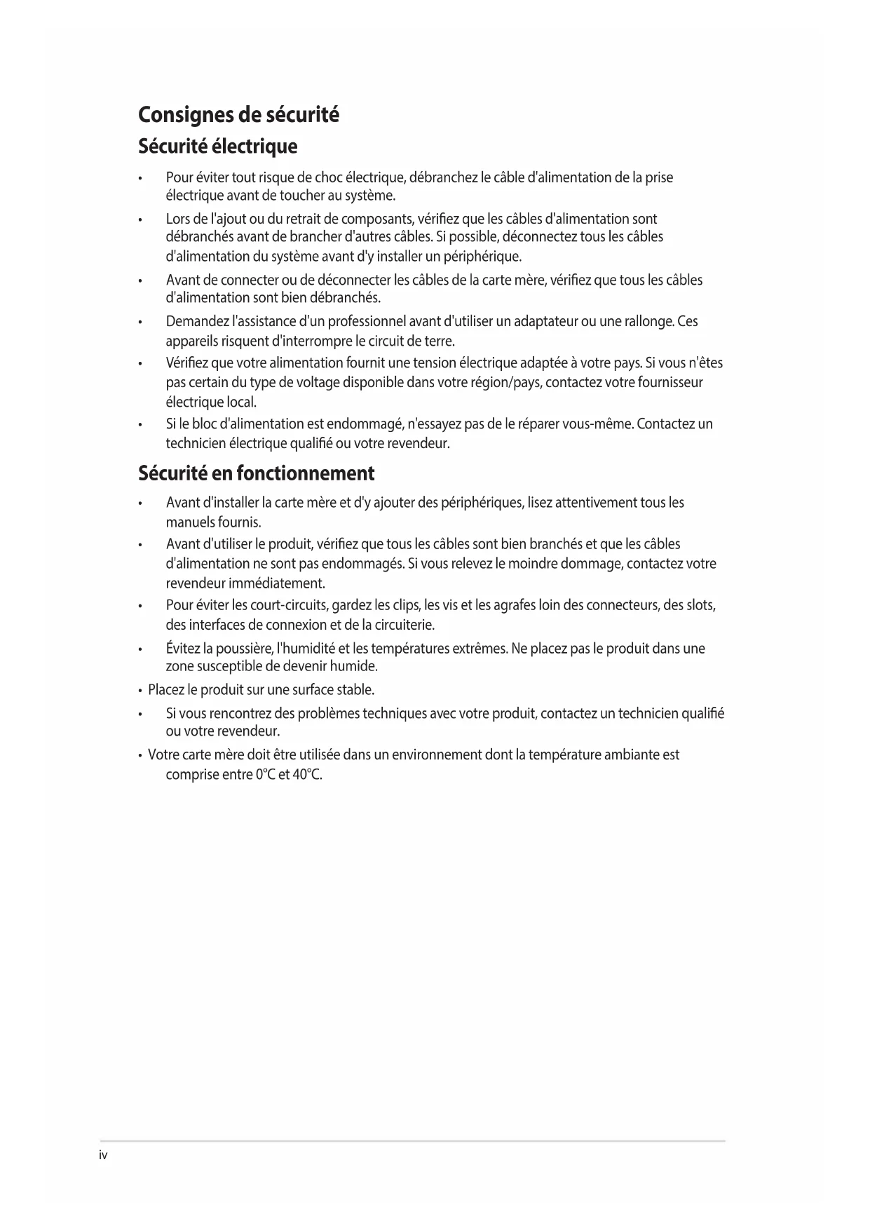 - Votre carte mère doit être utilisée dans un environnement dont la température ambiante est comprise entre 0°C et 40°C.v À propos de ce manuel Ce manuel de l'utilisateur contient les informations dont vous aurez besoin pour installer et congurer la carte mère. Organisation du manuel Ce manuel contient les parties suivantes :