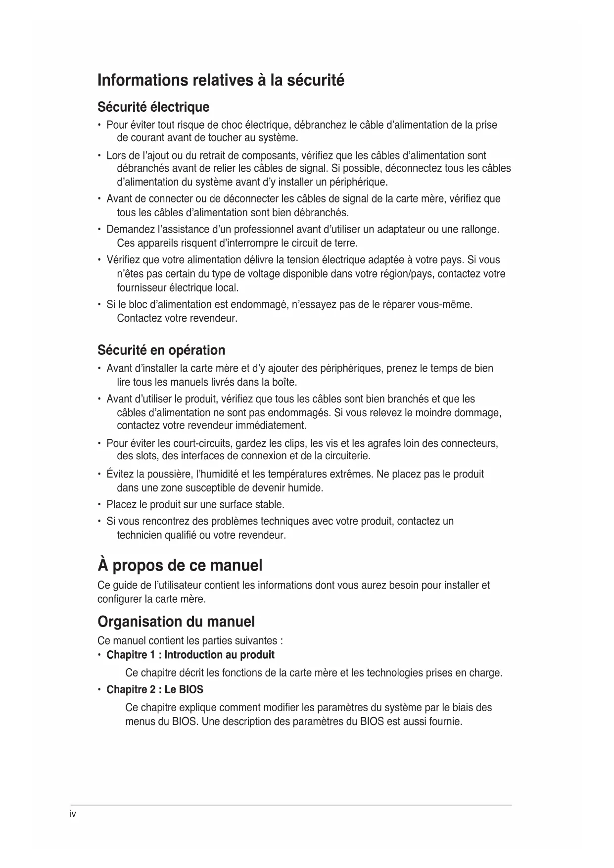 - Si vous rencontrez des problèmes techniques avec votre produit, contactez un technicien qualié ou votre revendeur. À propos de ce manuel Ce guide de l’utilisateur contient les informations dont vous aurez besoin pour installer et congurer la carte mère. Organisation du manuel Ce manuel contient les parties suivantes :