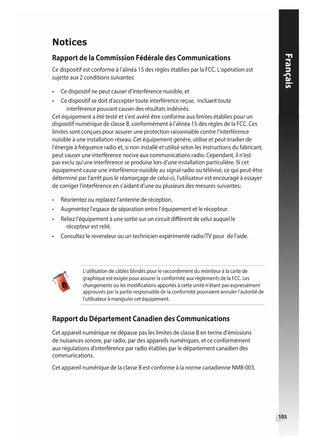 Appendice : résolution des problèmes de base ................................................18105 Français Notices Rapport de la Commission Fédérale des Communications Ce dispositif est conforme à l’alinéa 15 des règles établies par la FCC. L’opération est sujette aux 2 conditions suivantes:
