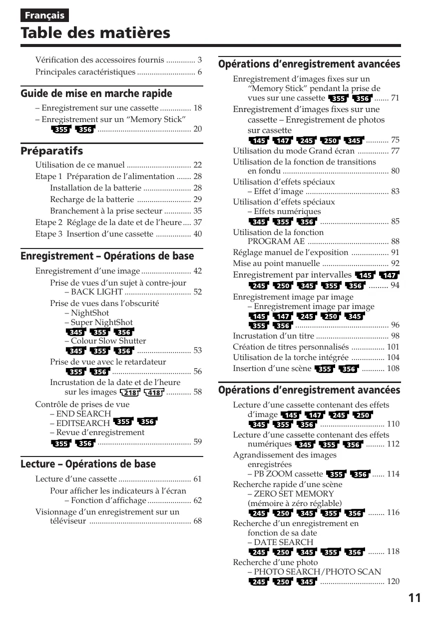 Fonctions permettant d’obtenir des films plus naturels •SPORTS (p. 88) •LANDSCAPE (p. 88) •Mise au point manuelle (p. 92) Fonctions pouvant être utilisées sur des cassettes enregistrées •END SEARCH (p. 59) •EDITSEARCH (p. 59)/Revue d’enregistrement (p. 60) •DATA CODE (p. 62) •PB ZOOM cassette (p. 114) •ZERO SET MEMORY (p. 116) •Easy Dubbing (Copie facile) (p. 126) •Montage numérique de programmes (p. 136)