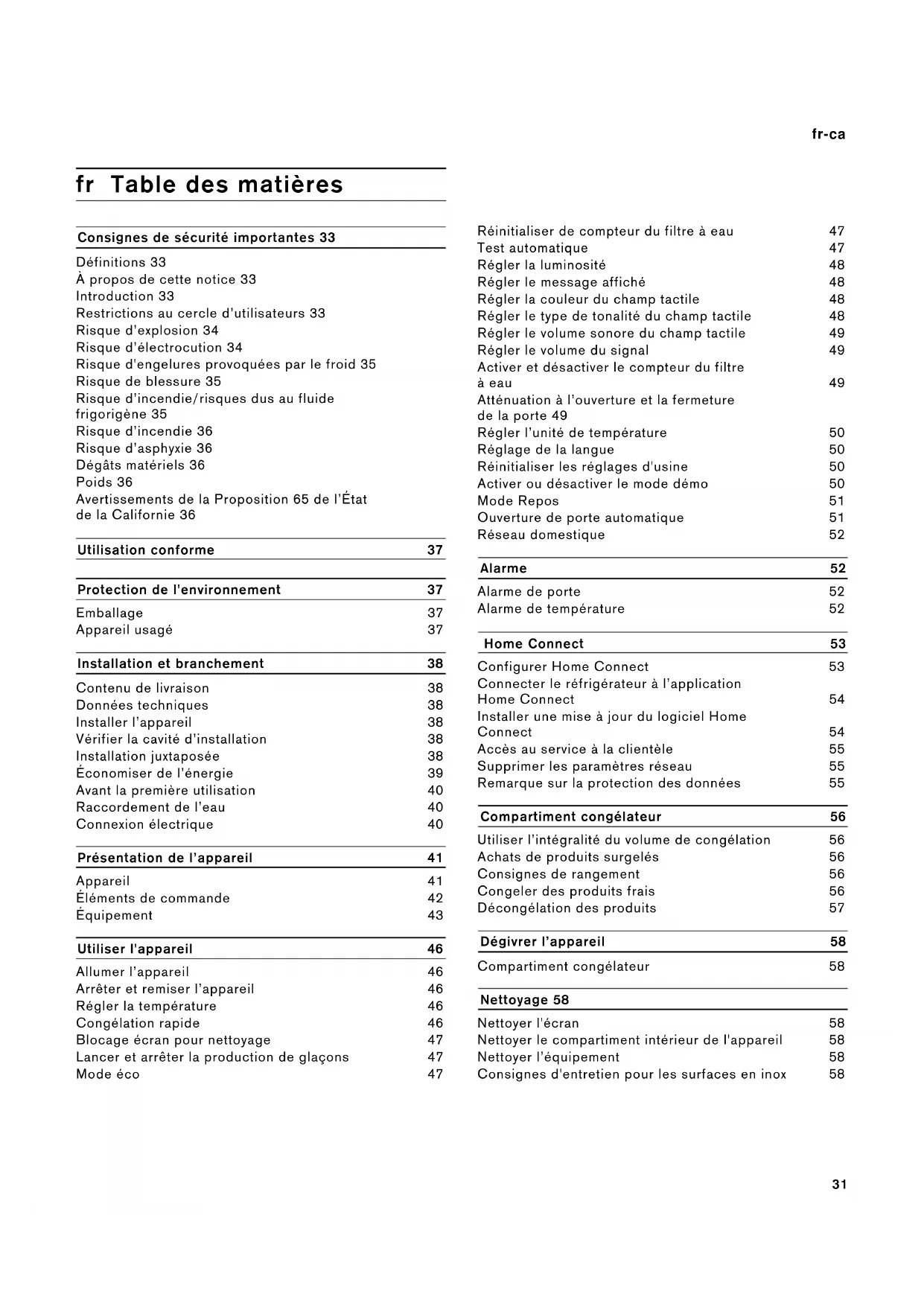 Risque d’incendie Les blocs multiprises ou blocs secteur portables peuvent surchauffer et provoquer un incendie. ▯ N’utilisez pas de blocs multiprises ni de blocs secteur portables derrière l’appareil. Risque d’asphyxie ▯ Appareils équipés d’une serrure : rangez la clé hors de portée des enfants. ▯ Ne confiez jamais l’emballage et ses pièces constitutives aux enfants. Dégâts matériels Pour éviter des dégâts matériels : ▯ Ne vous servez jamais du socle, des glissières ou des portes comme marchepieds et ne vous appuyez jamais dessus. ▯ Veillez à ce que les pièces en matière plastique et les joints de porte soient exempts d'huile et de graisse. ▯ Pour débrancher, ne saisissez que la fiche mâle, pas le cordon de branchement. Poids L’appareil est très lourd. Il faut être au moins 2 deux personnes pour installer et transporter l'appareil. ~ "Installation et branchement" à la page 38 Avertissements de la Proposition 65 de l’État de la Californie Ce produit pourrait contenir un produit chimique reconnu par l'État de la Californie comme cancérigène ou ayant des effets nocifs sur la reproduction. Par conséquent, l'emballage de votre produit pourrait porter l'étiquette suivante, comme requis par la Californie :37 Utilisation conforme fr-ca