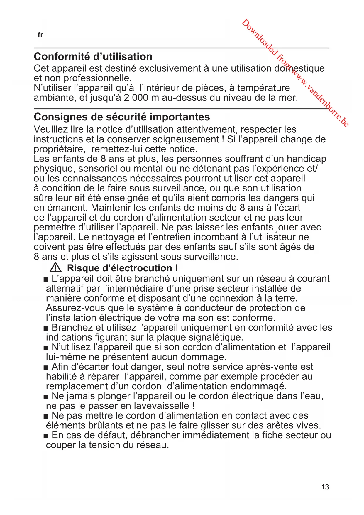 Conformité dʼutilisation Cet appareil est destiné exclusivement à une utilisation domestique et non professionnelle. Nʼutiliser lʼappareil quʼà lʼintérieur de pièces, à température ambiante, et jusquʼà 2 000 m au-dessus du niveau de la mer. Consignes de sécurité importantes Veuillez lire la notice dʼutilisation attentivement, respecter les instructions et la conserver soigneusement ! Si lʼappareil change de propriétaire, remettez-lui cette notice. Les enfants de 8 ans et plus, les personnes souffrant dʼun handicap physique, sensoriel ou mental ou ne détenant pas lʼexpérience et/ ou les connaissances nécessaires pourront utiliser cet appareil à condition de le faire sous surveillance, ou que son utilisation sûre leur ait été enseignée et quʼils aient compris les dangers qui en émanent. Maintenir les enfants de moins de 8 ans à lʼécart de lʼappareil et du cordon dʼalimentation secteur et ne pas leur permettre dʼutiliser lʼappareil. Ne pas laisser les enfants jouer avec lʼappareil. Le nettoyage et lʼentretien incombant à lʼutilisateur ne doivent pas être effectués par des enfants sauf sʼils sont âgés de 8 ans et plus et sʼils agissent sous surveillance. W Risque dʼélectrocution ! ■ Lʼappareil doit être branché uniquement sur un réseau à courant alternatif par lʼintermédiaire dʼune prise secteur installée de manière conforme et disposant dʼune connexion à la terre. Assurez-vous que le système à conducteur de protection de lʼinstallation électrique de votre maison est conforme. ■ Branchez et utilisez lʼappareil uniquement en conformité avec les indications figurant sur la plaque signalétique. ■ Nʼutilisez lʼappareil que si son cordon dʼalimentation et lʼappareil lui-même ne présentent aucun dommage. ■ Afin dʼécarter tout danger, seul notre service après-vente est habilité à réparer lʼappareil, comme par exemple procéder au remplacement dʼun cordon dʼalimentation endommagé. ■ Ne jamais plonger l’appareil ou le cordon électrique dans l’eau, ne pas le passer en lavevaisselle ! ■ Ne pas mettre le cordon d’alimentation en contact avec des éléments brûlants et ne pas le faire glisser sur des arêtes vives. ■ En cas de défaut, débrancher immédiatement la fiche secteur ou couper la tension du réseau. Downloaded from www.vandenborre.be14