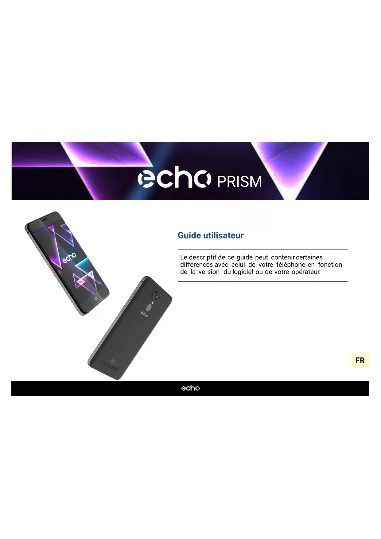www.echomobiles.com Guide utilisateur User guide PRISMGuide utilisateur Le descriptif de ce guide peut contenir certaines différences avec celui de votre téléphone en fonction de la version du logiciel ou de votre opérateur. PRISMFÉLICITATIONS! Avis Ce manuel a été réalisé avec la plus grande attention et a pour but de vous guider dans l’utilisation de cet appareil. Les informations et recommandations qui y figurent ne constituent cependant pas une garantie au sens des articles L211-4 et suivants du Code de la Consommation. ECHO se réserve le droit de modifier à tout moment les informations contenues dans ce manuel. Vous venez d’acquérir votre mobile ECHO PRISM. Vous trouverez dans ce guide toutes les informations relatives à l’utilisation de ce téléphone portable afin, nous le souhaitons, de vous familiariser rapidement avec l’univers ECHO. Copyright ©2017 ECHO www.echomobiles.com Les informations contenues dans ce manuel ne peuvent être en aucun cas transmises ou reproduites sous quelque forme que ce soit et sans l’autorisation écrite de ECHO. Limite de responsabilité L’intégralité des services et contenus accessibles de- puis cet appareil sont la propriété exclusive de tiers et sont donc protégés par des lois (Droit d’auteur, brevet, licence, et autres lois sur la propriété intellectuelle). Ces services sont réservés à votre usage personnel et non pour une utilisation commerciale. Il est impossible d’utiliser ces contenus ou services sans demande écrite au propriétaire du contenu. Vous ne pouvez en aucune manière copier, publier, transférer, vendre ou exploiter sur quelque support que ce soit, des contenus ou des services édités par le biais de cet appareil ou d’en produire des formes dérivées. Marques commerciales ECHO est une marque déposée de Modelabs Mobiles SAS.LES SERVICES ET CONTENUS DES TIERS SONT DELIVRÉS EN L’ÉTAT. ECHO NE GARANTIT PAS LES CONTENUS OU SERVICES AINSI DÉLIVRÉS, QUE CE SOIT DE MANIÈRE EXPRESSE OU IMPLICITE, À QUELQUE FIN QUE CE SOIT ; IL NE GARANTIT PAS