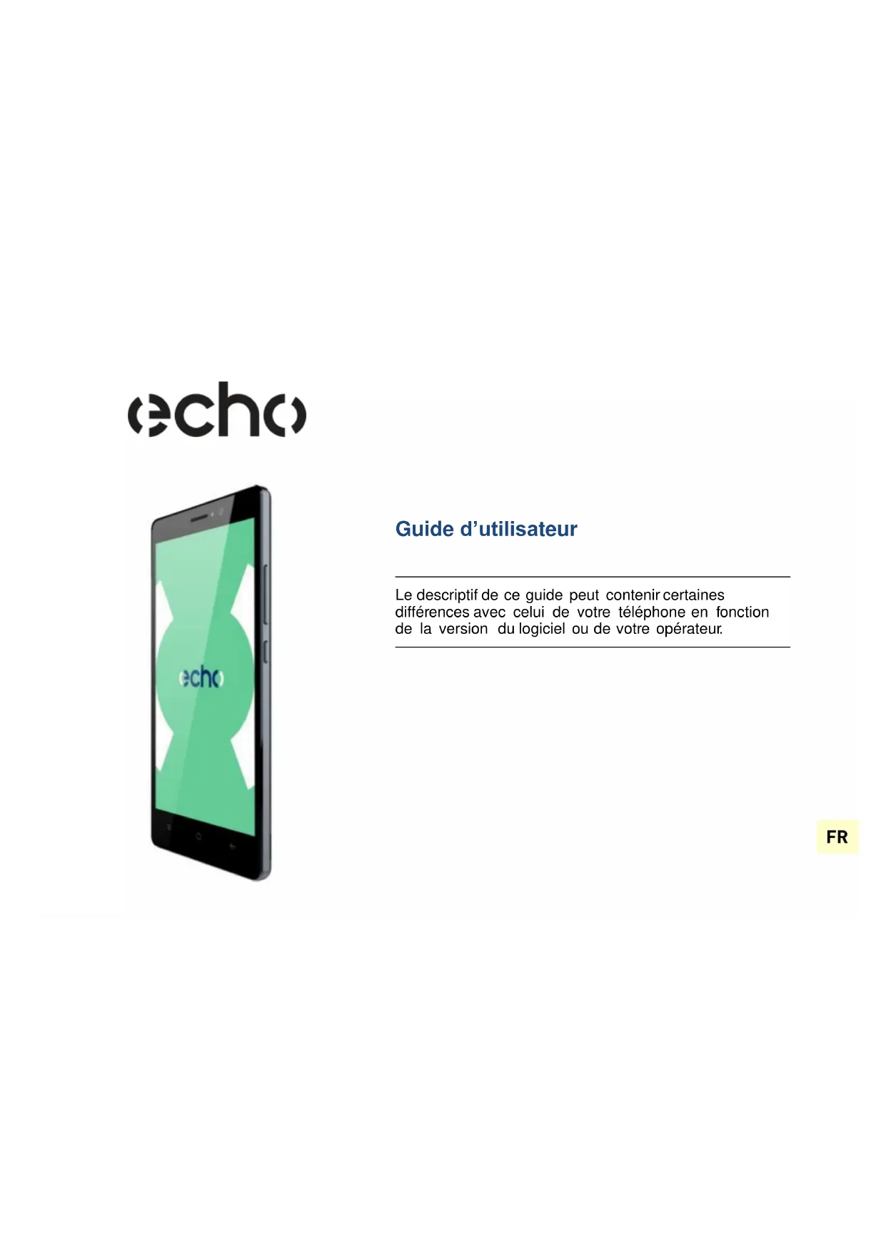 - Remove the battery from your device: on the back, you will see a label with your IMEI code. (For non- removable batteries, refer to the IMEI engraved on the telephone’s rear casing).NOTE: ECHO’s warranty does not cover normalwear and tear (batteries, screens, keyboards,camera lenses, etc.). Recycling The symbol of a crossed-out wheelie-bin, as found in this manual, indicates that the item is subject to European Directive 2002/96/EC, which states that electrical and electronic equipment, batteries, a cc um ula to rs a nd a cce ssorie s m ust unde rgo selective waste management. Make surethat, when your phone is no longer usable, you put it in a suitablewaste bin or returnit to a mobile phone retailer. In this way you will help to reduce environmental and health hazards. Local councils,retailers and national manufacturing associations will give you the necessary information on how to dispose of your old device.STATEMENT OF COMPLIANCE We, Modelabs Mobiles SAS - 107, rue de la B o é t i e – 75008 – P a r i s – F r a n c e , here by declare that the Echo Note mobile phone complies with the standards and provisions of the Directives. The procedure for the Statement of Compliance, set out in Article 10.5 of Directive 1999/5/EC, was conducted under the supervision of the following organisation: Intertek Testing & Certification Limited The full text of the device’sStatement of Compliance is available online at: https://www.echomobiles.com/assistance/ To prevent possible hearing damage, do not listen at high volume levels for long period 0359Guide d’utilisateur Le descriptif de ce guide peut contenir certaines différences avec celui de votre téléphone en fonction de la version du logiciel ou de votre opérateur.FÉLICITATIONS ! Avis Ce manuel a été réalisé avec la plus grande attention et a pour but de vous guider dans l’utilisation de cet appareil. Les informations et recommandations qui y figurent ne constituent cependant pas une garantie au sens des articles L211-4 et suivants du Code de la Consommation. ECHO se réserve le droit de modifier à tout moment les informations contenues dans ce manuel. Vous venez d’acquérir votre mobile ECHO Note. Vous trouverez dans ce guide toutes les informations relatives à l’utilisation de ce téléphone portable afin, nous le souhaitons, de vous familiariser rapidement avec l’univers ECHO. Copyright ©2015 ECHO www.echomobiles.com Les informations contenues dans ce manuel ne peuvent être en aucun cas transmises ou reproduites sous quelque forme que ce soit et sans l’autorisation écrite de ECHO. Limite de responsabilité L’intégralité des services et contenus accessibles de- puis cet appareil sont la propriété exclusive de tiers et sont donc protégés par des lois (Droit d’auteur, brevet, licence, et autres lois sur la propriété intellectuelle). Ces services sont réservés à votre usage personnel et non pour une utilisation commerciale. Il est impossible d’utiliser ces contenus ou services sans demande écrite au propriétaire du contenu. Vous ne pouvez en aucune manière copier, publier, transférer, vendre ou exploiter sur quelque support que ce soit, des contenus ou des services édités par le biais de cet appareil ou d’en produire des formes dérivées. Marques commerciales ECHO est une marque déposée de Modelabs Mobiles SAS.LES SERVICES ET CONTENUS DES TIERS SONT DELIVRÉS EN L’ÉTAT. ECHO NE