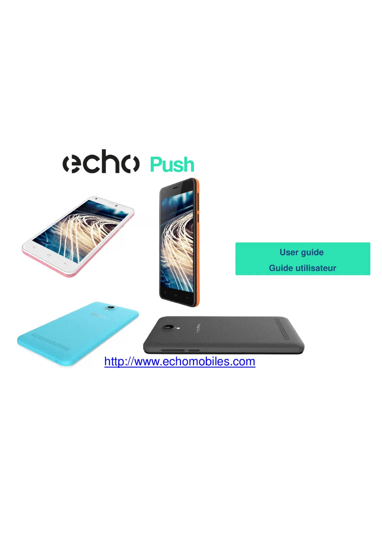 http://www.echomobiles.com Push User guide Guide utilisateurGuide utilisateur Push Le descriptif de ce guide peut contenir certaines différences avec celui de votre téléphone en fonction de la version du logiciel ou de votre opérateur.FÉLICITATIONS ! Avis Ce manuel a été réalisé avec la plus grande attention et a pour but de vous guider dans l’utilisation de cet appareil. Les informations et recommandations qui y figurent ne constituent cependant pas une garantie au sens des articles L211-4 et suivants du Code de la Consommation. ECHO se réserve le droit de modifier à tout moment les informations contenues dans ce manuel. Vous venez d’acquérir votre mobile ECHO Push. Vous trouverez dans ce guide toutes les informations relatives à l’utilisation de ce téléphone portable afin, nous le souhaitons, de vous familiariser rapidement avec l’univers ECHO. Copyright ©2017 ECHO www.echomobiles.com Les informations contenues dans ce manuel ne peuvent être en aucun cas transmises ou reproduites sous quelque forme que ce soit et sans l’autorisation écrite de ECHO. Limite de responsabilité L’intégralité des services et contenus accessibles de- puis cet appareil sont la propriété exclusive de tiers et sont donc protégés par des lois (Droit d’auteur, brevet, licence, et autres lois sur la propriété intellectuelle). Ces services sont réservés à votre usage personnel et non pour une utilisation commerciale. Il est impossible d’utiliser ces contenus ou services sans demande écrite au propriétaire du contenu. Vous ne pouvez en aucune manière copier, publier, transférer, vendre ou exploiter sur quelque support que ce soit, des contenus ou des services édités par le biais de cet appareil ou d’en produire des formes dérivées. Marques commerciales ECHO est une marque déposée de Modelabs Mobiles SAS.LES SERVICES ET CONTENUS DES TIERS SONT DELIVRÉS EN L’ÉTAT. ECHO NE