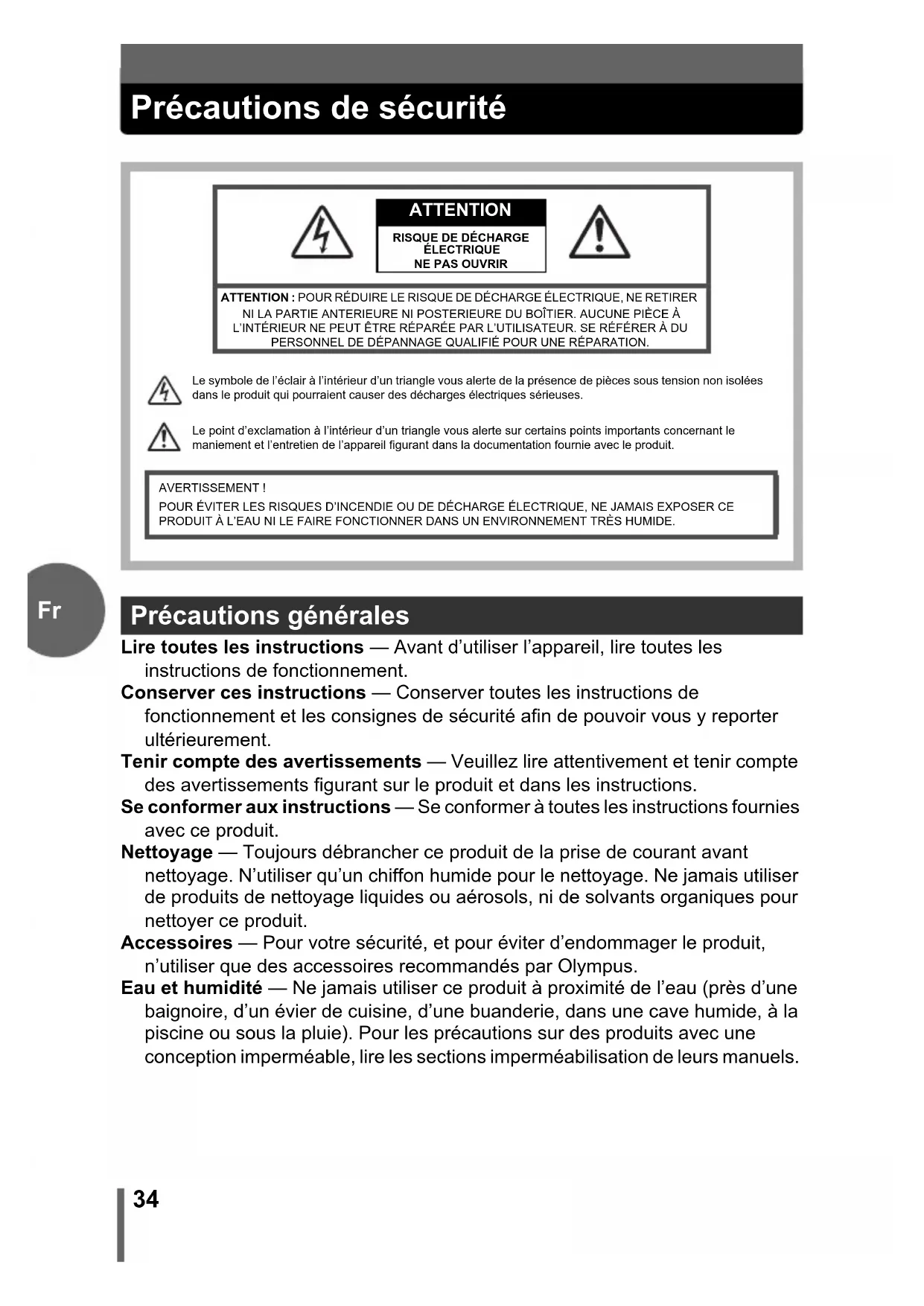 Précautions de sécurité Lire toutes les instructions — Avant d’utiliser l’appareil, lire toutes les instructions de fonctionnement. Conserver ces instructions — Conserver toutes les instructions de fonctionnement et les consignes de sécurité afin de pouvoir vous y reporter ultérieurement. Tenir compte des avertissements — Veuillez lire attentivement et tenir compte des avertissements figurant sur le produit et dans les instructions. Se conformer aux instructions — Se conformer à toutes les instructions fournies avec ce produit. Nettoyage — Toujours débrancher ce produit de la prise de courant avant nettoyage. N’utiliser qu’un chiffon humide pour le nettoyage. Ne jamais utiliser de produits de nettoyage liquides ou aérosols, ni de solvants organiques pour nettoyer ce produit. Accessoires — Pour votre sécurité, et pour éviter d’endommager le produit, n’utiliser que des accessoires recommandés par Olympus. Eau et humidité — Ne jamais utiliser ce produit à proximité de l’eau (près d’une baignoire, d’un évier de cuisine, d’une buanderie, dans une cave humide, à la piscine ou sous la pluie). Pour les précautions sur des produits avec une conception imperméable, lire les sections imperméabilisation de leurs manuels. Précautions générales ATTENTION : POUR RÉDUIRE LE RISQUE DE DÉCHARGE ÉLECTRIQUE, NE RETIRER NI LA PARTIE ANTERIEURE NI POSTERIEURE DU BOÎTIER. AUCUNE PIÈCE À L’INTÉRIEUR NE PEUT ÊTRE RÉPARÉE PAR L’UTILISATEUR. SE RÉFÉRER À DU PERSONNEL DE DÉPANNAGE QUALIFIÉ POUR UNE RÉPARATION.Le symbole de l’éclair à l’intérieur d’un triangle vous alerte de la présence de pièces sous tension non isolées dans le produit qui pourraient causer des décharges électriques sérieuses. Le point d’exclamation à l’intérieur d’un triangle vous alerte sur certains points importants concernant le maniement et l’entretien de l’appareil figurant dans la documentation fournie avec le produit.AVERTISSEMENT !POUR ÉVITER LES RISQUES D’INCENDIE OU DE DÉCHARGE ÉLECTRIQUE, NE JAMAIS EXPOSER CE PRODUIT À L’EAU NI LE FAIRE FONCTIONNER DANS UN ENVIRONNEMENT TRÈS HUMIDE. ATTENTION RISQUE DE DÉCHARGE ÉLECTRIQUE NE PAS OUVRIR d4247_basic_f_00_bookfile_7.book Page 34 Thursday, January 27, 2005 12:26 PMPrécautions de sécurité