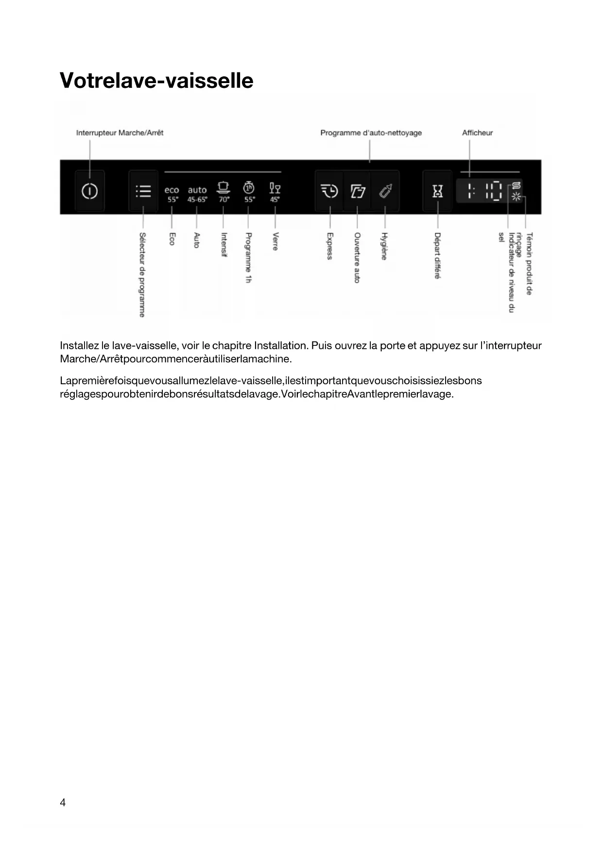 Rapide&Intensif (Auto + Express) est un programme efficace qui permet d'éliminer les restes légèrement desséchés. (Ce programme n'est pas destiné aux aliments brûlés, par exemple dans les plats à four.) Intensif Il est également idéal en cas d’exigences très élevées en matière d’hygiène, par exemple pour le lavage de biberons et de planches à découper. Un programme à haute température permettant de dissoudre la graisse sur de la vaisselle très sale, notamment les plats, casseroles et cocottes. Si ces ustensiles ne remplissent pas entièrement le lave-vaisselle, il est possible d'ajouter des assiettes ou d'autres articles. Programme 1h Un programme rapide qui permet d'éliminer les restes légèrement desséchés. (Ce programme n'est pas destiné aux aliments brûlés, par exemple dans les plats à four.) En combinaison avec Express, le programme sera plus court (15 minutes).