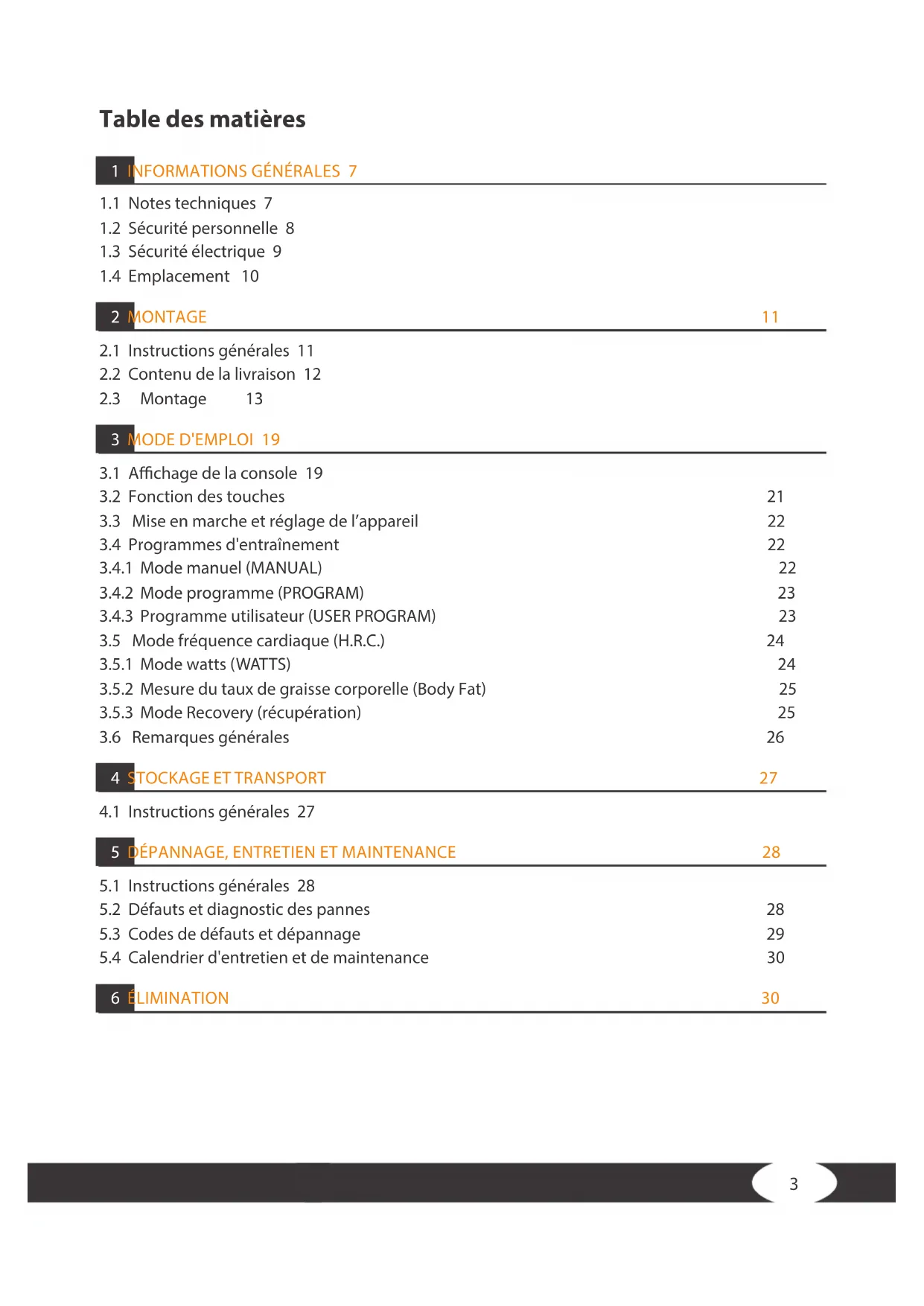 ⚠ DANGER + Avant la première utilisation de l'appareil, nous vous recommandons de demander l'avis d'un médecin an qu'il juge de la possibilité ou non de vous entraîner avec cet appareil. Ces dispositions sont particulièrement applicables aux personnes qui ont une prédisposition génétique à l'hypertension ou aux maladies cardiaques, sont âgées de plus de 45 ans, fument, présentent un taux de cholestérine élevé, sont en surpoids et/ou n'ont pas pratiqué régulièrement de sport au cours de l'année passée. Si vous prenez un traitement médicamenteux susceptible de générer des troubles du rythme cardiaque, l'avis d'un médecin est impératif. + Nous vous rappelons qu'un entraînement excessif peut sérieusement compromettre votre santé. Veuillez noter également que les systèmes de surveillance de la fréquence cardiaque ne sont pas toujours précis. Dès que vous percevez des sensations de faiblesse, de nausée, de vertiges, de douleurs, d'essouement ou d'autres symptômes anormaux, interrompez votre entraînement et consultez votre médecin en cas d'urgence. ⚠ AVERTISSEMENT + L’utilisation de cet appareil est interdite aux enfants de moins de 14 ans. + Les enfants ne doivent pas être laissés sans surveillance à proximité de l’appareil. + Les personnes handicapées doivent présenter un certicat médical et rester sous étroite surveillance lors de l’utilisation de tout appareil d’entraînement. + Attention : votre appareil n’a pas de roue libre. Les pièces en mouvement ne peuvent donc pas être stoppées immédiatement. + Notez que que les performances individuelles requises pour l’exécution d’un exercice peuvent diérer des performances mécaniques indiquées. + Avant de monter ou de descendre de l’appareil, vériez que l’une des pédales se trouve dans sa position la plus basse. + L’appareil ne doit pas être utilisé simultanément par plusieurs personnes. + Maintenez éloignés les mains, les pieds et autres parties du corps ainsi que les cheveux, vêtements, bijoux et autres objets des pièces mobiles. + Évitez de porter des vêtements amples ou volants pendant l’entraînement. Préférez une tenue de sport adaptée. Portez des chaussures de sport adaptées, de préférence avec des semelles en caoutchouc ou autre matériau antidérapant. Évitez de porter des chaussures à talon, avec semelles en cuir, à clous ou à crampons. Ne vous entraînez jamais pieds nus. ⚠ PRUDENCE + Si vous devez brancher votre appareil avec un câble d'alimentation sur le secteur, veillez à disposer le câble de manière à ce que personne ne risque de trébucher. + Durant l'entraînement, assurez-vous que personne ne se trouve dans la zone de mouvement de l'appareil. + Ne placez aucun objet dans les ouvertures de l'appareil.9