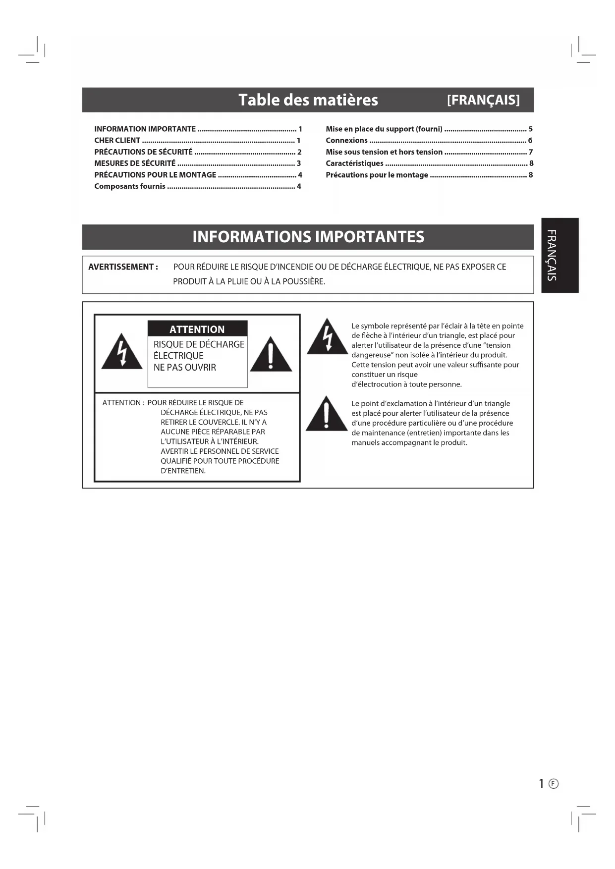- ATTENTION ATTENTION : POUR RÉDUIRE LE RISQUE DE DÉCHARGE ÉLECTRIQUE, NE PAS RETIRER LE COUVERCLE. IL N’Y A AUCUNE PIÈCE RÉPARABLE PAR L’UTILISATEUR À L’INTÉRIEUR. AVERTIR LE PERSONNEL DE SERVICE QUALIFIÉ POUR TOUTE PROCÉDURE D’ENTRETIEN.Le symbole représenté par l’éclair à la tête en pointe de èche à l’intérieur d’un triangle, est placé pour alerter l’utilisateur de la présence d’une “tension dangereuse” non isolée à l’intérieur du produit. Cette tension peut avoir une valeur susante pour constituer un risque d’électrocution à toute personne.Le point d’exclamation à l’intérieur d’un triangle est placé pour alerter l’utilisateur de la présence d’une procédure particulière ou d’une procédure de maintenance (entretien) importante dans les manuels accompagnant le produit. INFORMATIONS IMPORTANTES INFORMATION IMPORTANTE p. 1