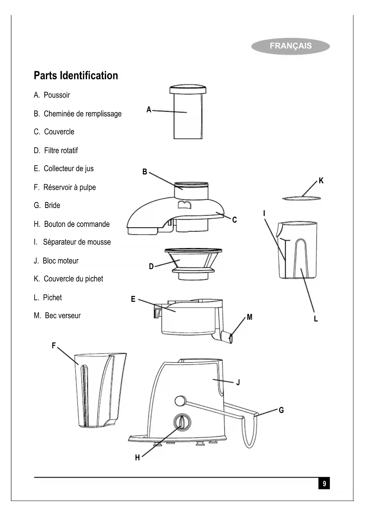 J. Bloc moteur K. Couvercle du pichet L. Pichet M. Bec verseur