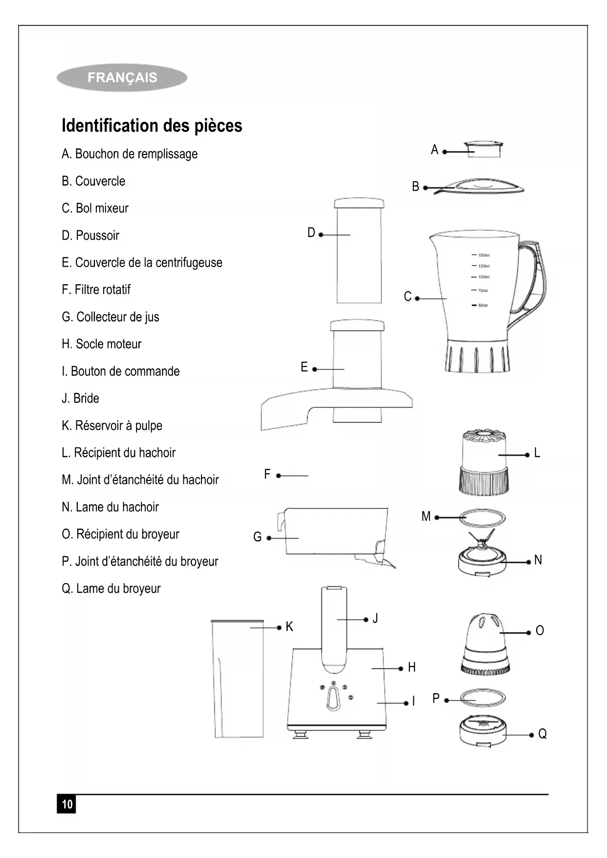ENGLISH10 FRANÇAIS Identification des pièces A. Bouchon de remplissage B. Couvercle C. Bol mixeur D. Poussoir E. Couvercle de la centrifugeuse F. Filtre rotatif G. Collecteur de jus H. Socle moteur