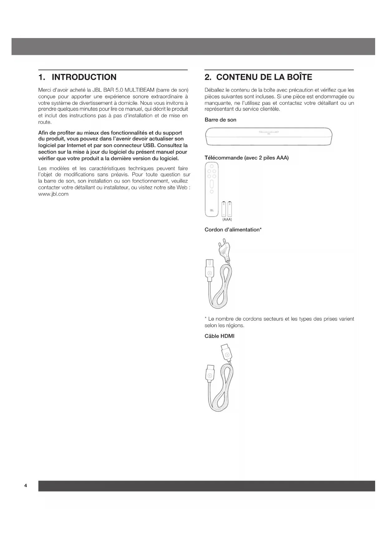 Merci d'avoir acheté la JBL BAR 5.0 MULTIBEAM (barre de son) conçue pour apporter une expérience sonore extraordinaire à votre système de divertissement à domicile. Nous vous invitons à prendre quelques minutes pour lire ce manuel, qui décrit le produit et inclut des instructions pas à pas d’installation et de mise en route. An de proter au mieux des fonctionnalités et du support du produit, vous pouvez dans l’avenir devoir actualiser son logiciel par Internet et par son connecteur USB. Consultez la section sur la mise à jour du logiciel du présent manuel pour vérier que votre produit a la dernière version du logiciel. Les modèles et les caractéristiques techniques peuvent faire l’objet de modications sans préavis. Pour toute question sur la barre de son, son installation ou son fonctionnement, veuillez contacter votre détaillant ou installateur, ou visitez notre site Web: www.jbl.com