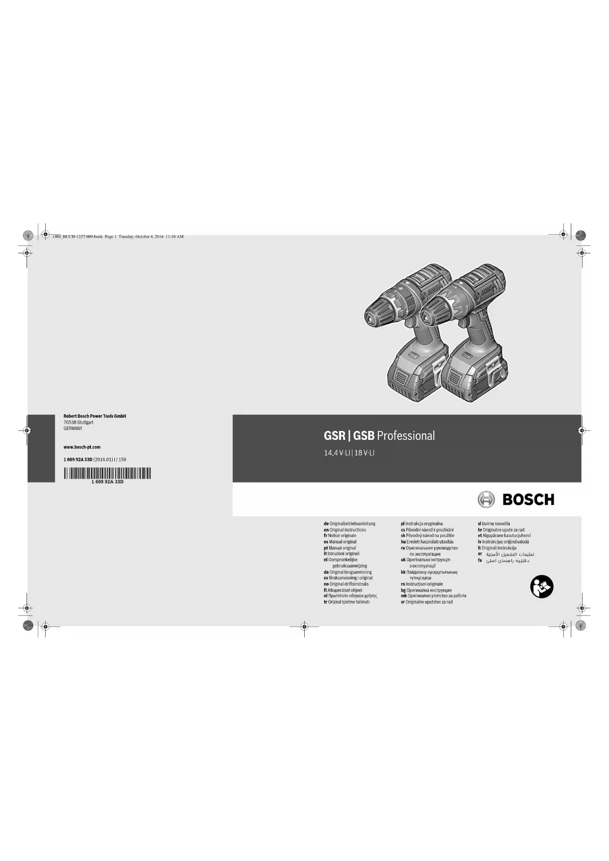 Selecting Accessories – 157 OBJ_BUCH-1227-009.book Page 11 Tuesday, October 4, 2016 10:43 AM12 | Français 1 609 92A 33D | (4.10.16) Bosch Power Tools Australia, New Zealand and Pacific Islands Robert Bosch Australia Pty. Ltd. Power Tools Locked Bag 66 Clayton South VIC 3169 Customer Contact Center Inside Australia: Phone: (01300) 307044 Fax: (01300) 307045 Inside New Zealand: Phone: (0800) 543353 Fax: (0800) 428570 Outside AU and NZ: Phone: +61 3 95415555 www.bosch.com.au Republic of South Africa Customer service Hotline: (011) 6519600 Gauteng – BSC Service Centre 35 Roper Street, New Centre Johannesburg Tel.: (011) 4939375 Fax: (011) 4930126 E-Mail: bsctools@icon.co.za KZN – BSC Service Centre Unit E, Almar Centre 143 Crompton Street Pinetown Tel.: (031) 7012120 Fax: (031) 7012446 E-Mail: bsc.dur@za.bosch.com Western Cape – BSC Service Centre Democracy Way, Prosperity Park Milnerton Tel.: (021) 5512577 Fax: (021) 5513223 E-Mail: bsc@zsd.co.za Bosch Headquarters Midrand, Gauteng Tel.: (011) 6519600 Fax: (011) 6519880 E-Mail: rbsa-hq.pts@za.bosch.com Transport The contained lithium-ion batteries are subject to the Danger- ous Goods Legislation requirements. The user can transport the batteries by road without further requirements. When being transported by third parties (e.g.: air transport or forwarding agency), special requirements on packaging and labelling must be observed. For preparation of the item being shipped, consulting an expert for hazardous material is re- quired. Dispatch batteries only when the housing is undamaged. Tape or mask off open contacts and pack up the battery in such a manner that it cannot move around in the packaging. Please also observe possibly more detailed national regula- tions. Disposal The machine, rechargeable batteries, accessories and packaging should be sorted for environmental- friendly recycling. Do not dispose of power tools and batteries/rechargeable batteries into household waste! Only for EC countries: According to the European Guideline 2012/19/EU, power tools that are no long- er usable, and according to the European Guideline 2006/66/EC, defective or used battery packs/batteries, must be collected separately and disposed of in an environ- mentally correct manner. Batteries no longer suitable for use can be directly returned at: Great Britain Robert Bosch Ltd. (B.S.C.) P.O. Box 98 Broadwater Park North Orbital Road Denham Uxbridge UB 9 5HJ At www.bosch-pt.co.uk you can order spare parts or arrange the collection of a product in need of servicing or repair. Tel. Service: (0344) 7360109 E-Mail: boschservicecentre@bosch.com Subject to change without notice. Français Avertissements de sécurité généraux pour l’outil Lire tous les avertissements de sécurité et toutes les ins- tructions. Ne pas suivre les avertissements et instructions peut donner lieu à un choc électrique, un incendie et/ou une blessure sérieuse. Conserver tous les avertissements et toutes les instruc- tions pour pouvoir s’y reporter ultérieurement. Le terme « outil » dans les avertissements fait référence à votre outil électrique alimenté par le secteur (avec cordon d’alimentation) ou votre outil fonctionnant sur batterie (sans cordon d’alimentation). Sécurité de la zone de travail Conserver la zone de travail propre et bien éclairée. Les zones en désordre ou sombres sont propices aux acci- dents. AVERTISSEMENT OBJ_BUCH-1227-009.book Page 12 Tuesday, October 4, 2016 10:43 AMFrançais | 13 Bosch Power Tools 1 609 92A 33D | (4.10.16) Ne pas faire fonctionner les outils électriques en at- mosphère explosive, par exemple en présence de li- quides inflammables, de gaz ou de poussières. Les ou- tils électriques produisent des étincelles qui peuvent enflammer les poussières ou les fumées. Maintenir les enfants et les personnes présentes à l’écart pendant l’utilisation de l’outil. Les distractions peuvent vous faire perdre le contrôle de l’outil. Sécurité électrique Il faut que les fiches de l’outil électrique soient adap- tées au socle. Ne jamais modifier la fiche de quelque fa- çon que ce soit. Ne pas utiliser d’adaptateurs avec des outils à branchement de terre. Des fiches non modifiées et des socles adaptés réduiront le risque de choc élec- trique. Eviter tout contact du corps avec des surfaces reliées à la terre telles que les tuyaux, les radiateurs, les cuisi- nières et les réfrigérateurs. Il existe un risque accru de choc électrique si votre corps est relié à la terre. Ne pas exposer les outils à la pluie ou à des conditions humides. La pénétration d’eau à l’intérieur d’un outil aug- mentera le risque de choc électrique. Ne pas maltraiter le cordon. Ne jamais utiliser le cordon pour porter, tirer ou débrancher l’outil. Maintenir le cordon à l’écart de la chaleur, du lubrifiant, des arêtes ou des parties en mouvement. Les cordons endommagés ou emmêlés augmentent le risque de choc électrique. Lorsqu’on utilise un outil à l’extérieur, utiliser un pro- longateur adapté à l’utilisation extérieure. L’utilisation d’un cordon adapté à l’utilisation extérieure réduit le risque de choc électrique. Si l’usage d’un outil dans un emplacement humide est inévitable, utiliser une alimentation protégée par un dispositif à courant différentiel résiduel (RCD). L’usage d’un RCD réduit le risque de choc électrique. Sécurité des personnes Rester vigilant, regarder ce que vous êtes en train de faire et faire preuve de bon sens dans l’utilisation de l’outil. Ne pas utiliser un outil lorsque vous êtes fatigué ou sous l’emprise de drogues, d’alcool ou de médica- ments. Un moment d’inattention en cours d’utilisation d’un outil peut entraîner des blessures graves des per- sonnes. Utiliser un équipement de sécurité. Toujours porter une protection pour les yeux. Les équipements de sécu- rité tels que les masques contre les poussières, les 