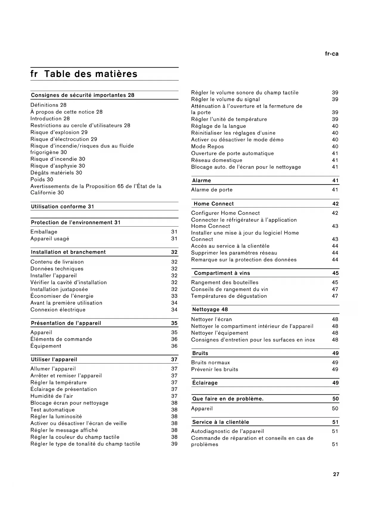 Risque d’incendie/risques dus au fluide frigorigène Dans les tubulures du circuit frigorifique circule une petite quantité de R600a, un fluide frigorigène écologique mais combustible. Le fluide frigorigène risque en fuyant de blesser les yeux ou de s'enflammer. ▯ Ne pas endommager les tubulures. Si les tubulures ont été endommagées : ▯ Eloignez l’appareil de toute flamme nue ou source d’inflammation. ▯ Aérez la pièce.▯ Éteignez l’appareil puis débranchez la fiche de contact de la prise de courant. ▯ Appelez le service à la clientèle. Risque d’incendie Les blocs multiprises ou blocs secteur portables peuvent surchauffer et provoquer un incendie. ▯ N’utilisez pas de blocs multiprises ni de blocs secteur portables derrière l’appareil. Risque d’asphyxie ▯ Appareils équipés d’une serrure : rangez la clé hors de portée des enfants. ▯ Ne confiez jamais l’emballage et ses pièces constitutives aux enfants. Dégâts matériels Pour éviter des dégâts matériels : ▯ Ne vous servez jamais du socle, des glissières ou des portes comme marchepieds et ne vous appuyez jamais dessus. ▯ Veillez à ce que les pièces en matière plastique et les joints de porte soient exempts d'huile et de graisse. ▯ Pour débrancher, ne saisissez que la fiche mâle, pas le cordon de branchement. Poids L’appareil est très lourd. Il faut être au moins 2 deux personnes pour installer et transporter l'appareil. ~ "Installation et branchement" à la page 32 Avertissements de la Proposition 65 de l’État de la Californie Ce produit pourrait contenir un produit chimique reconnu par l'État de la Californie comme cancérigène ou ayant des effets nocifs sur la reproduction. Par conséquent, l'emballage de votre produit pourrait porter l'étiquette suivante, comme requis par la Californie :31 Utilisation conforme fr-ca