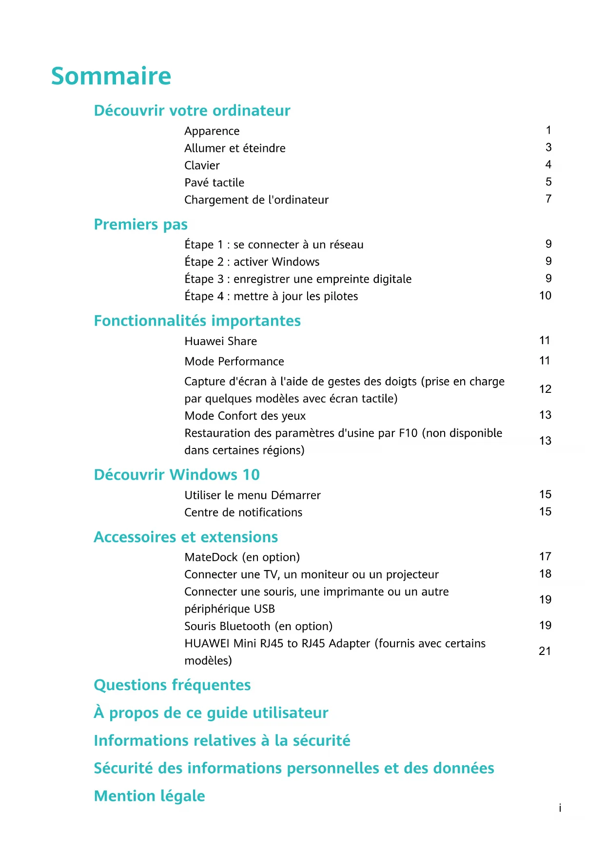 Questions fréquentes À propos de ce guide utilisateur Informations relatives à la sécurité Sécurité des informations personnelles et des données Mention légale iDécouvrir votre ordinateur Apparence