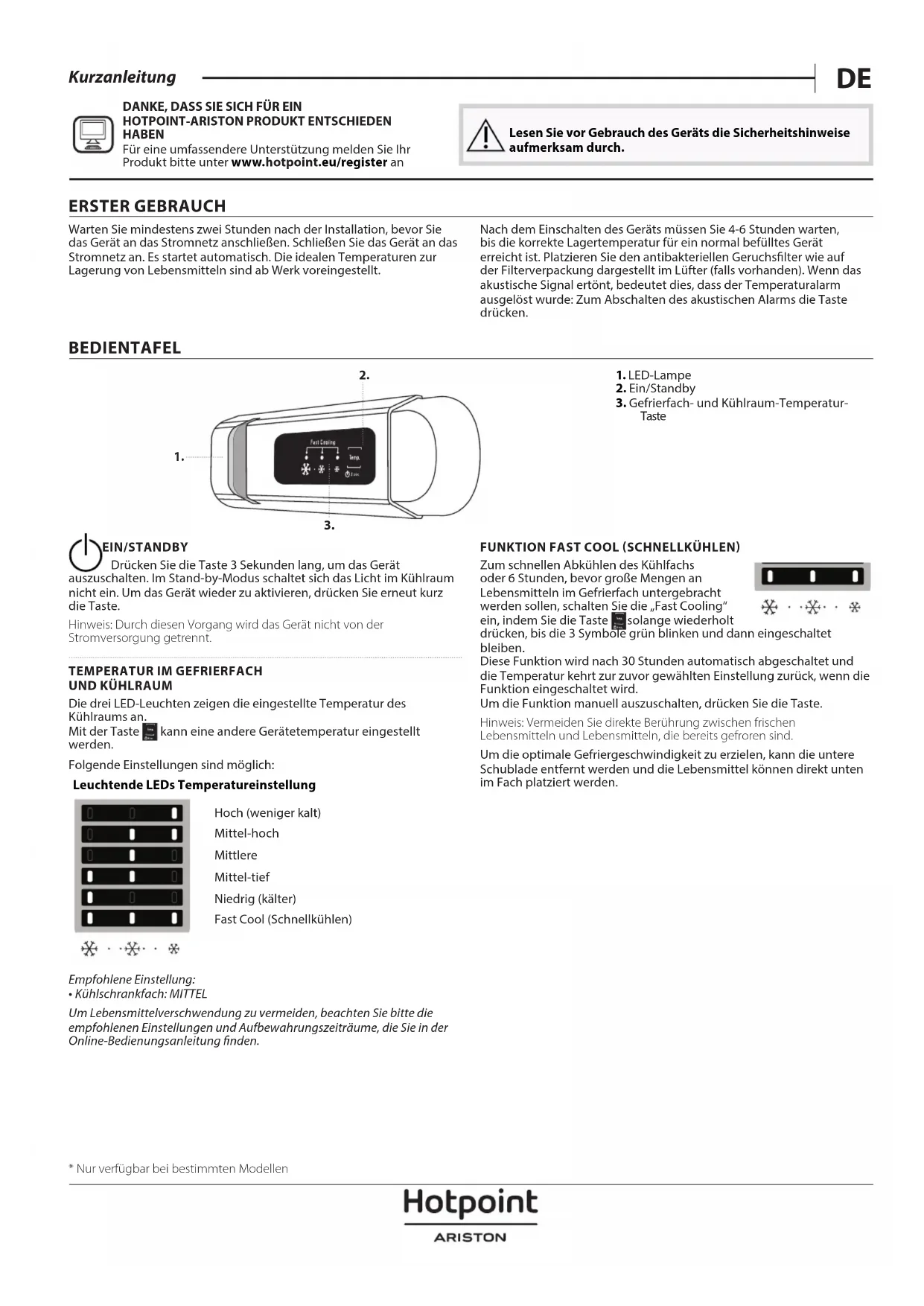 PRODUIT HOTPOINT-ARISTON An de proter d’une assistance complète, veuillez enregistrer votre produit sur www . hotpoint .eu/ register Lisez attentivement les consignes de sécurité avant d’utiliser l’appareil. 1ÈRE UTILISATION Attendre au moins deux heures après l’installation avant de brancher l’appareil à l’alimentation électrique. Brancher l'appareil à l'alimentation électrique démarre le fonctionnement automatiquement. Les températures idéales de stockage des aliments sont préréglées en usine. Après avoir allumé l’appareil, vous devez patienter de 4 à 6 heures pour atteindre la température de conservation appropriée pour un appareil normalement rempli. Selon le modèle, placez le ltre anti-odeurs et antibactérien dans le ventilateur comme illustré sur l’emballage du ltre. Si le signal sonore retentit, cela signie que l’alarme de température est intervenue: appuyez sur le bouton pour éteindre les alarmes sonores.