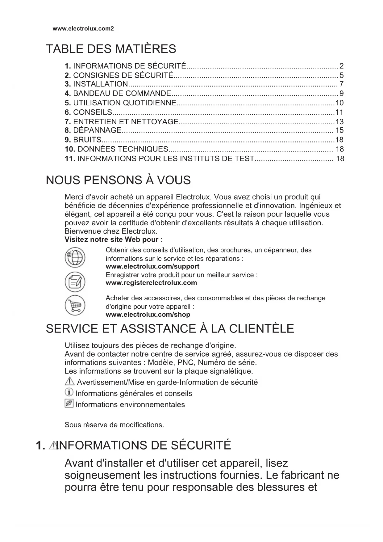 Avant d'installer et d'utiliser cet appareil, lisez soigneusement les instructions fournies. Le fabricant ne pourra être tenu pour responsable des blessures et www.electrolux.com2dégâts résultant d'une mauvaise installation ou utilisation. Conservez toujours les instructions dans un lieu sûr et accessible pour vous y référer ultérieurement.