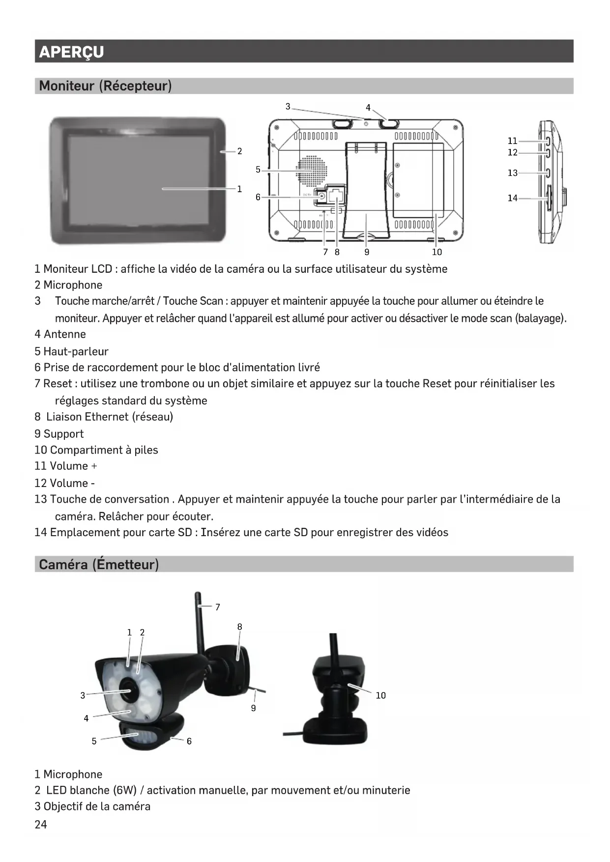 Touche marche/arrêt / Touche Scan : appuyer et maintenir appuyée la touche pour allumer ou éteindre le moniteur. Appuyer et relâcher quand l'appareil est allumé pour activer ou désactiver le mode scan (balayage). 4 Antenne 5 Haut-parleur 6 Prise de raccordement pour le bloc d'alimentation livré 7 Reset : utilisez une trombone ou un objet similaire et appuyez sur la touche Reset pour réinitialiser les réglages standard du système 8 Liaison Ethernet (réseau) 9 Support 10 Compartiment à piles 11 Volume + 12 Volume - 13 Touche de conversation . Appuyer et maintenir appuyée la touche pour parler par l’intermédiaire de la caméra. Relâcher pour écouter. 14 Emplacement pour carte SD : Insérez une carte SD pour enregistrer des vidéos Caméra (Émetteur) 1 Microphone 2 LED blanche (6W) / activation manuelle, par mouvement et/ou minuterie 3 Objectif de la caméra
