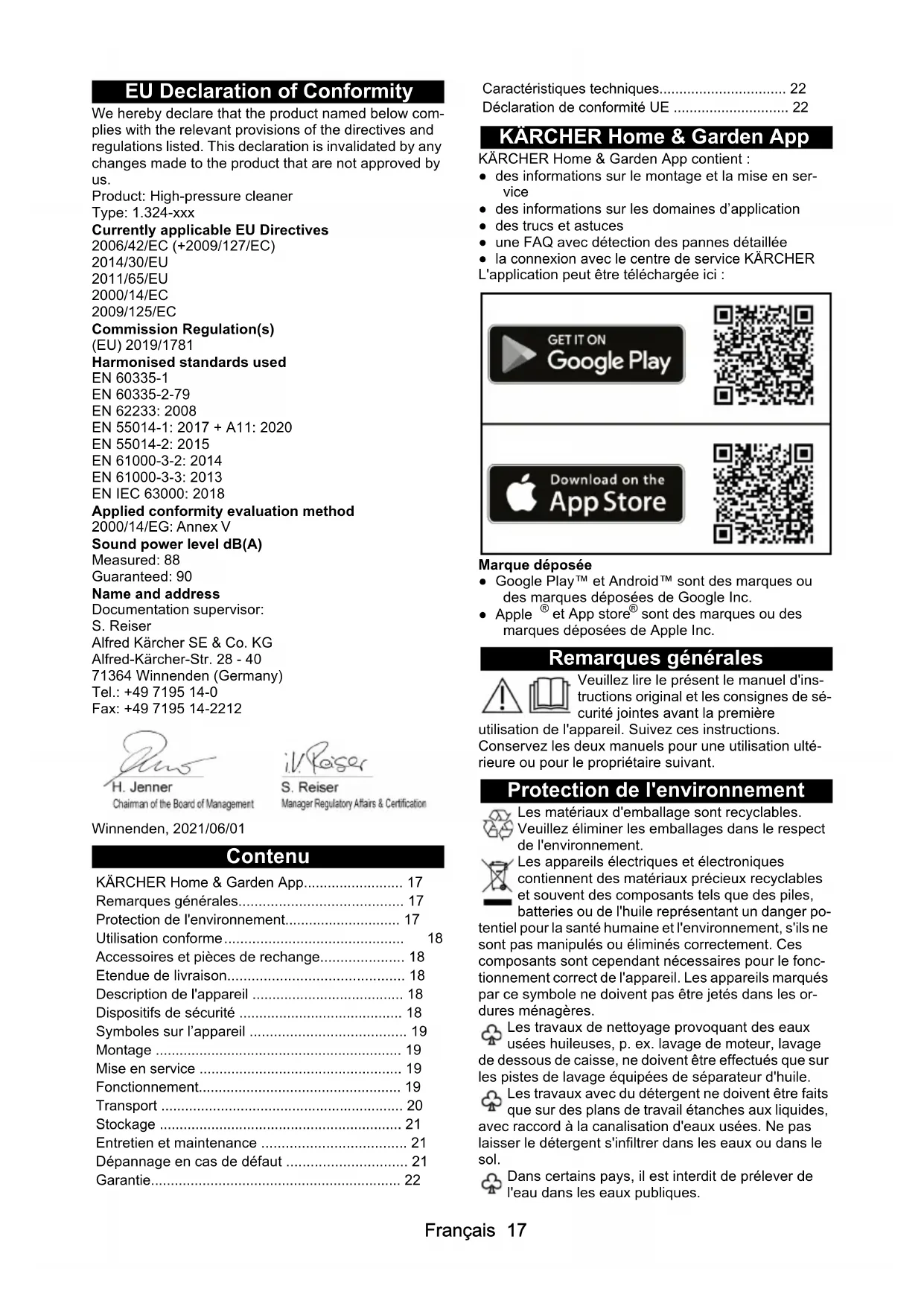 - sont des marques ou des marques déposées de Apple Inc. Remarques générales Veuillez lire le présent le manuel d'ins- tructions original et les consignes de sé- curité jointes avant la première utilisation de l'appareil. Suivez ces instructions. Conservez les deux manuels pour une utilisation ulté- rieure ou pour le propriétaire suivant. Protection de l'environnement Les matériaux d'emballage sont recyclables. Veuillez éliminer les emballages dans le respect de l'environnement. Les appareils électriques et électroniques contiennent des matériaux précieux recyclables et souvent des composants tels que des piles, batteries ou de l'huile représentant un danger po- tentiel pour la santé humaine et l'environnement, s'ils ne sont pas manipulés ou éliminés correctement. Ces composants sont cependant nécessaires pour le fonc- tionnement correct de l'appareil. Les appareils marqués par ce symbole ne doivent pas être jetés dans les or- dures ménagères. Les travaux de nettoyage provoquant des eaux usées huileuses, p. ex. lavage de moteur, lavage de dessous de caisse, ne doivent être effectués que sur les pistes de lavage équipées de séparateur d'huile. Les travaux avec du détergent ne doivent être faits que sur des plans de travail étanches aux liquides, avec raccord à la canalisation d'eaux usées. Ne pas laisser le détergent s'infiltrer dans les eaux ou dans le sol. Dans certains pays, il est interdit de prélever de l'eau dans les eaux publiques. KÄRCHER Home & Garden App p. 17