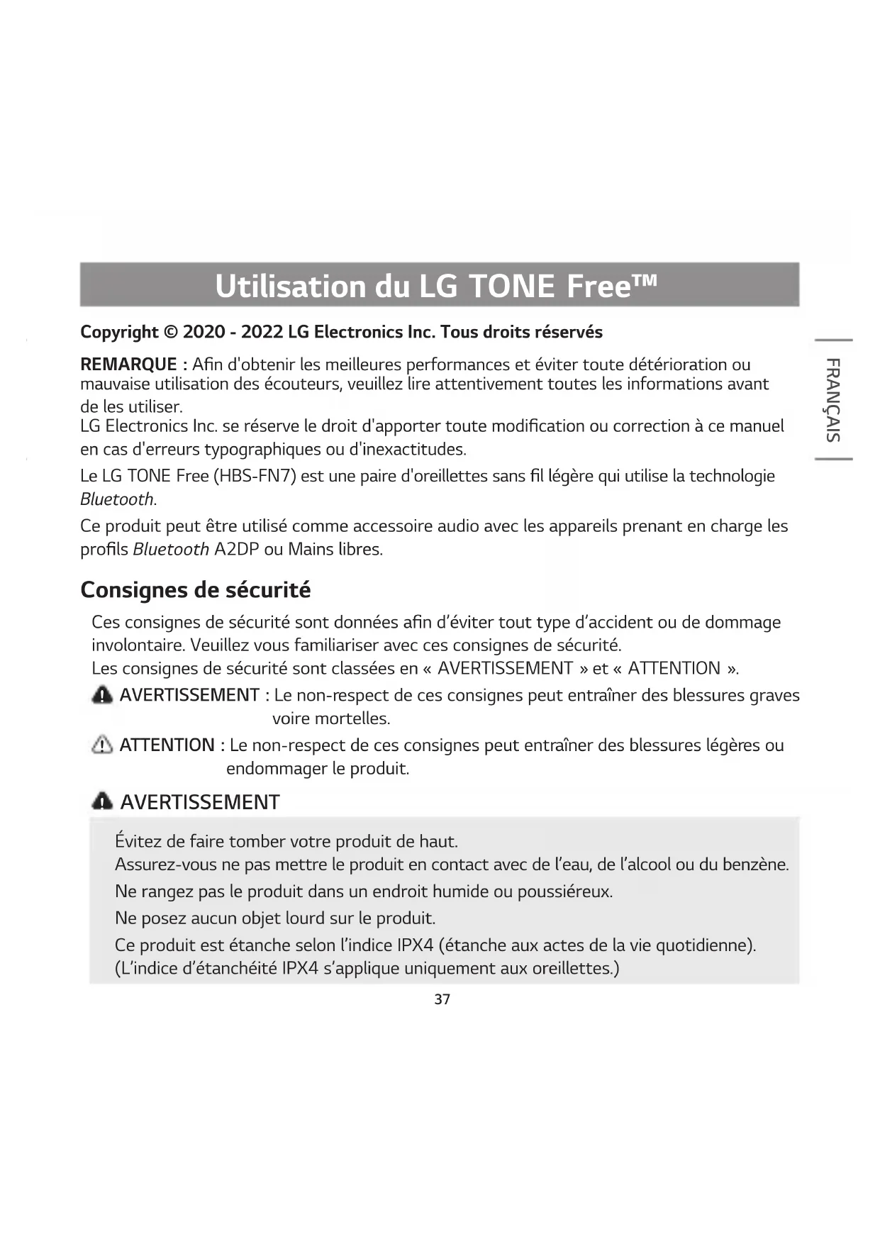 Copyright © 2020 - 2022 LG Electronics Inc. Tous droits réservés REMARQUE: An d'obtenir les meilleures performances et éviter toute détérioration ou mauvaise utilisation des écouteurs, veuillez lire attentivement toutes les informations avant de les utiliser. LG Electronics Inc. se réserve le droit d'apporter toute modication ou correction à ce manuel en cas d'erreurs typographiques ou d'inexactitudes. Le LGTONEFree (HBS-FN7) est une paire d'oreillettes sans l légère qui utilise la technologie Bluetooth. Ce produit peut être utilisé comme accessoire audio avec les appareils prenant en charge les prols Bluetooth A2DP ou Mains libres. Consignes de sécurité Ces consignes de sécurité sont données an d’éviter tout type d’accident ou de dommage involontaire. Veuillez vous familiariser avec ces consignes de sécurité. Les consignes de sécurité sont classées en «AVERTISSEMENT» et «ATTENTION».
