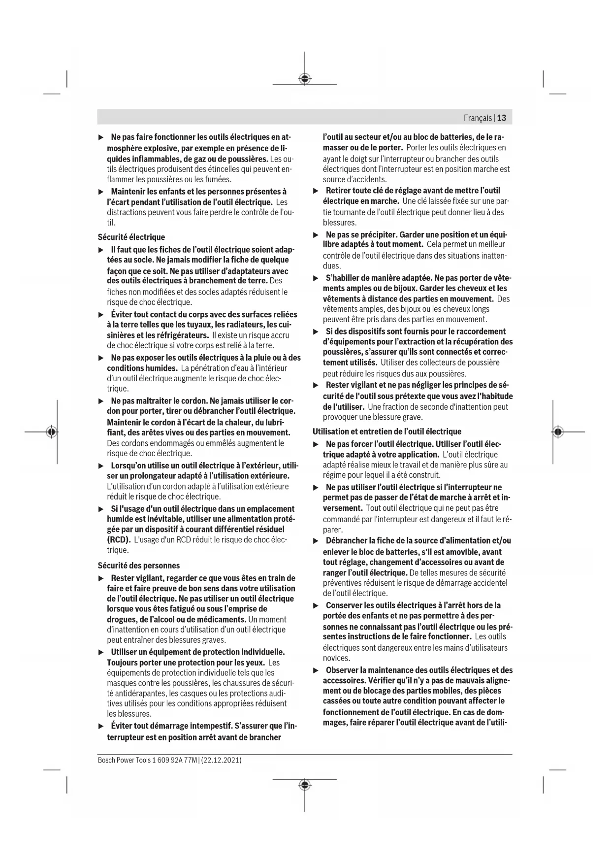 Mise en place d’un accessoire de travail (voir figure G) Remarque: N’utilisez pas d’accessoires non SDS plus pour perforer ou buriner! Les accessoires non SDS plus et leur mandrin seraient endommagés lors des travaux de perfora- tion ou burinage. – Mettez en place le mandrin interchangeable à serrage ra- pide (1). – Tenez fermement la bague de maintien (23) du mandrin interchangeable à serrage rapide. En tournant la bague avant (22), ouvrez le porte-outil jusqu’à ce que l’acces- soire puisse être introduit. Maintenez en position la bague de maintien (23) et tournez la bague avant (22) avec force dans le sens de la flèche jusqu’à ce qu’un bruit de cliquet soit nettement audible. – Vérifiez que l’accessoire est bien fixé en tirant dessus. Remarque: Si le porte-outil a été ouvert à fond, il est pos- sible qu’un bruit de cliquet soit audible lorsque vous essayez de fermer le porte-outil et que le porte-outil ne se ferme pas. Dans un tel cas, tournez la bague avant (22) une fois dans le sens opposé à la flèche. Il est ensuite possible de fermer le porte-outil normalement. – Tournez le sélecteur stop de rotation/de frappe (11) dans la position «Perçage». Bosch Power Tools 1 609 92A 77M | (22.12.2021)18 | Français Retrait d’un accessoire de travail (voir figure H) – Tenez fermement la bague de maintien (23) du mandrin interchangeable à serrage rapide. En tournant la bague avant (22), ouvrez le porte-outil dans le sens de la flèche jusqu’à ce que l’accessoire puisse être extrait. Aspiration de poussières/de copeaux Les poussières de matériaux tels que peintures contenant du plomb, certains bois, minéraux ou métaux, peuvent être nui- sibles à la santé. Le contact avec les poussières ou leur inha- lation peut entraîner des réactions allergiques et/ou des ma- ladies respiratoires auprès de l’utilisateur ou des personnes se trouvant à proximité. Certaines poussières telles que les poussières de chêne ou de hêtre sont considérées comme cancérigènes, surtout en association avec des additifs pour le traitement du bois (chromate, lasure). Les matériaux contenant de l’amiante ne doivent être travaillés que par des personnes qualifiées. – Si possible, utilisez un dispositif d’aspiration des pous- sières approprié au matériau. – Veillez à bien aérer la zone de travail. – Il est recommandé de porter un masque respiratoire avec un niveau de filtration de classe P2. Respectez les règlements spécifiques aux matériaux à traiter en vigueur dans votre pays. u Évitez toute accumulation de poussières sur le lieu de travail. Les poussières peuvent facilement s’enflammer. Aspiration des poussières avec set d’aspiration (accessoire) Montage du dispositif d’aspiration (voir figure I) Pour l’aspiration des poussières, un set d’aspiration (acces- soire) est nécessaire. Pendant le perçage, le set d’aspiration s’écarte automatiquement de manière à ce que la tête d’aspi- ration soit toujours très près de la surface usinée. – Appuyez sur le bouton de réglage de la butée de profon- deur (12) et retirez la butée de profondeur (13). Ap- puyez de nouveau sur le bouton (12) et insérez le set d’aspiration par l’avant dans la poignée supplémentaire (14). – Raccordez un flexible d’aspiration (diamètre 19mm, ac- cessoire) à l’ouverture d’aspiration (24) du set d’aspira- tion. L’aspirateur doit être conçu pour le type de matériau à pon- cer. Pour l’aspiration de poussières particulièrement nuisibles à la santé, cancérigènes ou sèches, utilisez un aspirateur spé- cial. Réglage de la profondeur de perçage sur le set d’aspiration (voir figure J) Vous pouvez aussi régler la profondeur de perçageX souhai- tée une fois que le set d’aspiration est monté. – Poussez à fond l’accessoire de travail SDS-plus dans le porte-outil SDS-plus (3). Si l’accessoire SDS-plus n’est pas poussé à fond, le réglage de la profondeur de perçage risque d’être faussé. – Desserrez la vis papillon du set d’aspiration (28). – Appuyez fermement l’outil électroportatif éteint contre la surface, à l’endroit où le trou doit être percé. L’accessoire de travail SDS-plus doit toucher la surface. – Glissez le tube de guidage (29) set d’aspiration dans son support de façon à ce que la tête d’aspiration appuie contre la surface à percer. Ne poussez pas le tuyau de gui- dage (29) plus que nécessaire par dessus le tube télesco- pique (27), de sorte qu’une grande partie de l’échelle gra- duée du tube télescopique (27) reste visible. – Resserrez la vis papillon (28). Desserrez la vis de serrage (25) sur la butée de profondeur du set d’aspiration. – Déplacez la butée de profondeur (26) sur le tube télesco- pique (27) jusqu’à ce que la distance X indiquée sur l’illustration corresponde à la profondeur de perçage sou- haitée. – Serrez la vis de serrage (25) dans cette position. Fonctionnement Mise en marche u Tenez compte de la tension du réseau! La tension de la source de courant doit correspondre aux indica- tions se trouvant sur la plaque signalétique de l’outil électroportatif. Les outils électroportatifs marqués 230V peuvent également fonctionner sur 220V. Sélection d’un mode de fonctionnement GBH2-24RE: Sélectionnez le mode de fonctionnement voulu de l’outil électroportatif avec le sélecteur «Perçage/ Perforation»(16). – Pour changer de mode de fonctionnement, appuyez sur le bouton de déverrouillage(15) et tournez le sélecteur «Perçage/Perforation»(16) dans la position voulue jus- qu’à ce qu’il s’enclenche. Remarque: ne changez de mode de fonctionnement que lorsque l’outil électroportatif est éteint! Vous risqueriez d’endommager l’outil électroportatif. Position pour perforer dans le béton et dans la pierre naturelle Position pour percer sans percussion dans le bois, le métal, l