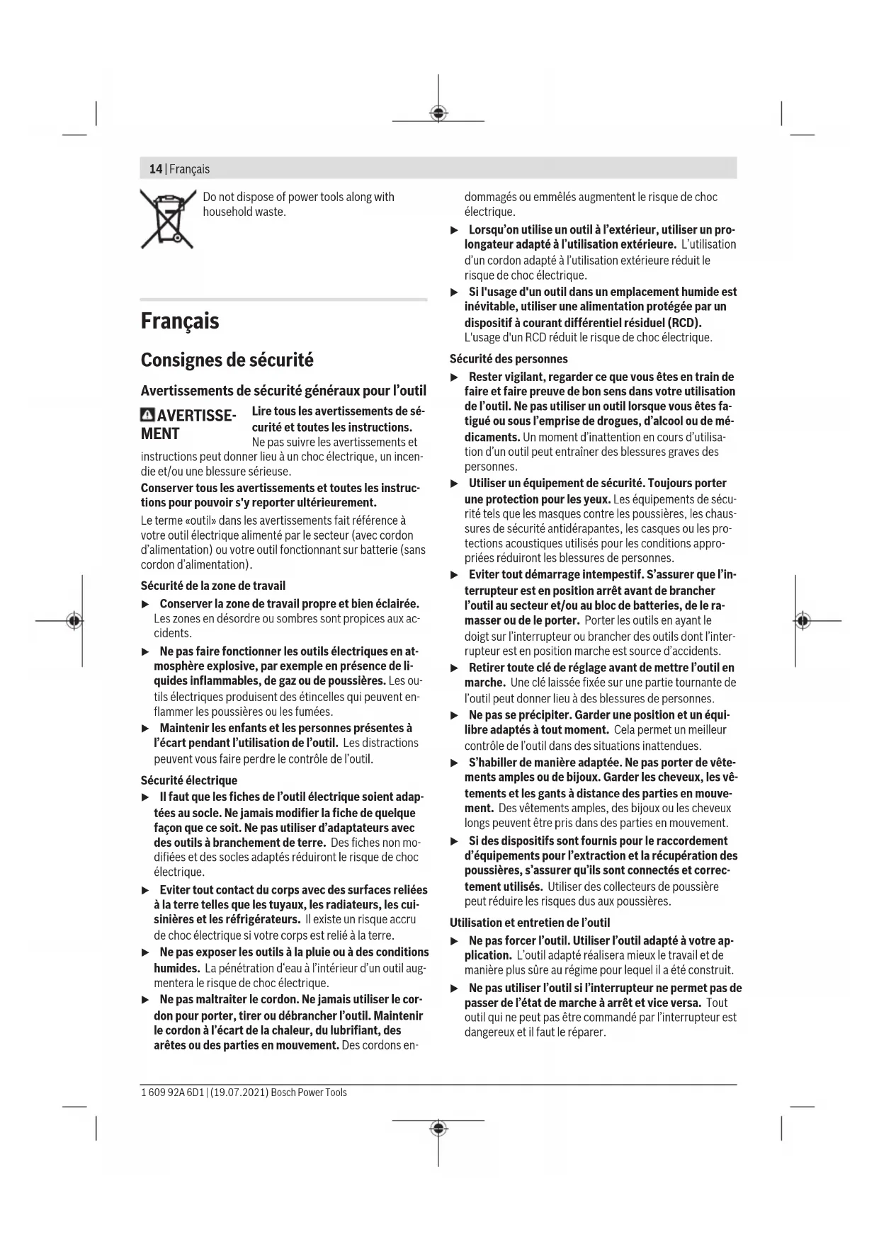 Protection anti-redémarrage – ● ● – Poids selon EPTA-Procedure 01:2014 – avec poignée supplémentaire antivibrations kg 2,1 2,1 2,1 2,1 – avec poignée supplémentaire standard kg 2,0 2,0 2,0 2,0 Indice de protection / II / II / II / II Les données indiquées sont valables pour une tension nominale [U] de 230 V. Elles peuvent varier lorsque la tension diffère de cette valeur et sur certaines versions destinées à certains pays. Montage Montage du dispositif de protection u Débranchez le câble d’alimentation de la prise avant d’effectuer des travaux quels qu’il soient sur l’outil électroportatif. Remarque : En cas de cassure de la meule ou du disque pen- dant l’utilisation ou de détérioration des dispositifs de fixa- tion sur le capot de protection/l’outil électroportatif, en- voyez sans tarder l’outil électroportatif dans un centre de service après-vente. Pour les adresses, reportez-vous à la section « Service après-vente et conseil utilisateurs ». Capot de protection pour meulage Placez le capot de protection (7) sur la fixation de l’outil électroportatif jusqu’à ce que les ergots de codage du capot de protection viennent se lo- ger dans les évidements de la fixation. Appuyez pour cela sur le levier de déverrouillage (1) et maintenez-le actionné. Montez le capot de protec- tion (7) sur le collet de broche en exerçant une pres- sion jusqu’à ce que l’épaule- ment du capot de protection repose sur le flasque de l’outil électroportatif et tournez le capot de protection jusqu’à ce qu’il s’enclenche de façon perceptible. 1 609 92A 6D1 | (19.07.2021) Bosch Power ToolsFrançais | 19 Ajustez la position du capot de protection (7) en fonction des besoins du travail à effectuer. Pour cela, poussez le le- vier de déverrouillage (1) vers le haut et tournez le capot de protection (7) dans la position souhaitée. u Orientez le capot de protection (7) de sorte que les deux ergots du levier de déverrouillage (1) viennent se loger dans les évidements correspondants du capot de protection (7). u Orientez le capot de protection (7) de façon à éviter les projections d’étincelles en direction de l’utilisa- teur. u Le capot de protection (7) ne doit pouvoir tourner que si l’on appuie sur le levier de déverrouillage (1)! Si ce- la n’est pas le cas, ne continuez en aucun cas à utiliser l’outil électroportatif, confiez-le au Service Après- Vente pour réparation. Remarque: Les ergots de codage se trouvant sur le capot de protection (7) font en sorte que seul le capot de protection adapté à l’outil électroportatif puisse être monté. Capot de protection spécial tronçonnage u Pour les opérations de tronçonnage au moyen d’abra- sifs agglomérés, toujours utiliser le capot de protec- tion spécial tronçonnage (9). u Lors du tronçonnage de matières minérales, veillez à assurer une aspiration suffisante des poussières. Le capot de protection spécial tronçonnage (9) se monte comme le capot de protection spécial meulage (7). Capot de protection spécial tronçonnage avec glissière de guidage Le capot de protection spécial tronçonnage avec glissière de guidage (18) se monte comme le capot de protection spécial meulage (7). Poignée supplémentaire u N’utilisez l’outil électroportatif qu’avec la poignée supplémentaire (6). Vissez la poignée supplémentaire (6) du côté gauche ou du côté droit de la tête de meuleuse, selon les besoins. Poignée supplémentaire antivibrations La poignée supplémentaire antivibrations réduit les vi- brations et rend l’utilisation de l’outil électroportatif plus confortable et plus sûre. u N’apportez aucune modification à la poignée supplé- mentaire. Ne continuez pas à travailler quand la poignée supplé- mentaire est endommagée. Protège-main u Pour les travaux avec la brosse boisseau/brosse circu- laire (15) ou la couronne de forage diamantée (20), montez toujours le protège-main (14). Fixez le protège-main (14) avec la poignée supplémentaire (6). Mise en place et retrait des accessoires de meulage Observez les consignes de montage spéci- fiques des accessoires X-LOCK. u Débranchez le câble d’alimentation de la prise avant d’effectuer des travaux quels qu’il soient sur l’outil électroportatif. u Attendez que les meules à ébarber et les disques à tronçonner aient refroidi avant de les toucher. Les meules deviennent brûlantes pendant le travail. u N’utilisez que des accessoires X-LOCK d’origine arborant le logo X-LOCK. Seuls les accessoires X-LOCK d’origine garantissent le respect de l’épaisseur de serrage maxi- male de 1,6mm. Lorsque l’épaisseur de serrage est plus importante, l’accessoire est mal fixé et il risque de se dé- tacher. u Les accessoires X-LOCK ne nécessitent aucun flasque de serrage ou flasque support supplémentaire. u Vérifiez que l’accessoire de travail et sa fixation ne sont pas déformés et qu’ils sont exempts de saletés et de par- ticules. N’utilisez que des meules et accessoires de meulage aux di- mensions prescrites. Assurez-vous que les deux ergots de verrouillage X-LOCK sont ouverts (voir la figure suivante) avant de fixer l’acces- soire X-LOCK. Nettoyez si nécessaire l’espace entre les deux ergots X- LOCK. Mise en place d’un accessoire de meulage ➊ Positionnez l’accessoire (meule / disque à tronçonner / disque à lamelles) du bon côté et de façon centrée sur le porte-outil X-LOCK, en veillant à ce qu’il soit parallèle à la surface d’appui. ➋ Exercez une pression en direction du porte-outil. ➌ La meule / le disque s’enclenche de manière audible. Veillez ce faisant à ne pas actionner le levier (3). Bosch Power Tools 1 609 92A 6D1 | (19.07.2021)20 | Français (3) u Après avoir mis en place l’accessoire, assurez-vous que le bord de l’accessoire (