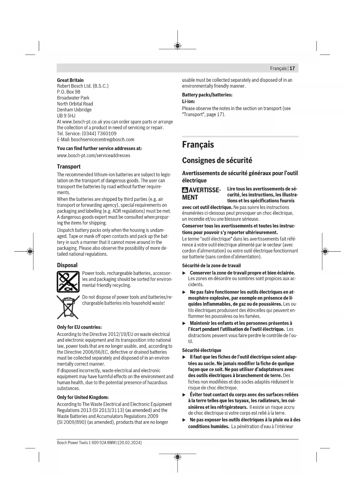Insert the sanding sheet (6) under the rear clamping bracket (2). Ensure that the sanding sheet (6) is not too short and that it is correctly clamped. Swivel the sand- ing-sheet clamp (4) back into the starting position and lock it in place. ❸ Position the sanding paper so that it fits tightly around the sanding plate (3). Clamp the front part of the sand- ing sheet under the front clamping bracket (7). Ensure that the sanding sheet (6) is not too short and that it is correctly clamped. Swivel the sanding-sheet clamp (4) back into the starting position and lock it in place. Unperforated sanding sheets, e.g. from rolls or bulk stock sold by the metre, can be perforated using the punch (17) for the purpose of dust extraction. To do this, fit the sanding sheet on the power tool and push the tool down onto the punch (see figureF). To remove the sanding sheet (6), unlock both sanding-sheet clamps (4) and pull the sanding sheet out of its bracket. Selecting a sanding sheet Different sanding sheets are available, depending on the ma- terial you are working with and the required surface removal rate: Grit For processing all wood and wood-based ma- terials 40–180 For pre-sanding, e.g. of rough and un- even beams and boards Coarse 40 For surface sanding and levelling of slight irregularities Medium 80, 120 For finish-sanding and fine sanding of hardwoods Fine 180 For processing paint and lacquer layers or primers such as fillers and bodyfillers 40–180 For sanding down paint Coarse 40 For sanding undercoats Medium 80, 120 For final sanding of primers prior to painting Fine 180 For any finishing work, such as polishing (metal and stone in particular), use fleece/polishing felt. Different types of fleece and polishing felts should be used depending on the surface finish required on the workpiece. Dust/Chip Extraction The dust from materials such as lead paint, some types of wood, minerals and metal can be harmful to human health. Touching or breathing in this dust can trigger allergic reac- tions and/or cause respiratory illnesses in the user or in people in the near vicinity. Certain dusts, such as oak or beech dust, are classified as carcinogenic, especially in conjunction with wood treatment additives (chromate, wood preservative). Materials contain- ing asbestos may only be machined by specialists. – Use a dust extraction system that is suitable for the ma- terial wherever possible. – Provide good ventilation at the workplace. Bosch Power Tools 1 609 92A 8MW | (20.02.2024)16 | English – It is advisable to wear a P2 filter class breathing mask. The regulations on the material being machined that apply in the country of use must be observed. u Avoid dust accumulation at the workplace. Dust can easily ignite. Self-generated dust extraction with dust box (see figures E1–E4) Place the dust box (1) onto the extraction outlet (15) until it clicks into place. To empty the dust box (1), pull the dust box downwards. Before opening the dust box (1), knock the dust box against a firm surface as shown in the figure to loosen the dust from the filter element. Take hold of the dust box (1) by the recessed grip, fold the filter element (16) upwards out of the way and empty the dust box. Use a soft brush to clean the flaps of the filter ele- ment (16). External dust extraction The dust extractor must be suitable for the material being worked. When extracting dry dust that is especially detrimental to health or carcinogenic, use a special dust extractor. Operation Starting Operation Switching On/Off u Make sure that you are able to press the On/Off switch without releasing the handle. To switch on the power tool, tilt the on/off switch (8) to- ward the right to the “I” position. To switch off the power tool, tilt the on/off switch (8) to- ward the left to the “O” position. Battery charge indicator The three green LEDs of the battery charge indicator (10) show the charging status of the battery (11). For safety reasons, it is only possible to check the charging status when the power tool is at a standstill. Press the button (9) to display the charging status. This is also possible when the battery (11) is removed. LEDs Capacity 3× continuous green light ≥66% 2× continuous green light ≥33% 1× continuous green light <33% 1× flashing green light Reserve If no LED lights up after pressing the button (9), then the battery is defective and must be replaced. Temperature-dependent overload protection In normal conditions of use, the power tool cannot be over- loaded. If the power tool is overloaded or the permitted bat- tery temperature is exceeded, the electronics of the power tool will switch off until the temperature returns to within the optimum operating temperature range. Practical advice u Before carrying out any work on the power tool (e.g. maintenance, tool change etc.), remove the battery from the power tool. There is risk of injury from uninten- tionally pressing the on/off switch. u Always wait until the power tool has come to a com- plete stop before placing it down. The material removal rate when sanding is primarily determ- ined by the choice of sanding sheet. Only immaculate sanding sheets achieve good sanding per- formance and make the power tool last longer. Be sure to apply consistent contact pressure in order to in- crease the lifetime of the sanding sheets. Excessively increasing the contact pressure will not lead to increased sanding performance; rather, it will cause more severe wear of the power tool and premature failure of the sanding plate. Do not use a sanding sheet for other materials after it has been used to work on metal. Use only original Bosch-sanding accessories. Recommendations for Optimal Handling of the Battery Protect the battery against moisture and water. Only store the battery within a temperature range of −20 to 50°C. Do not leave the battery in your car in the summer, for example. Occasionally clean the ventilation slots on the battery using a sof