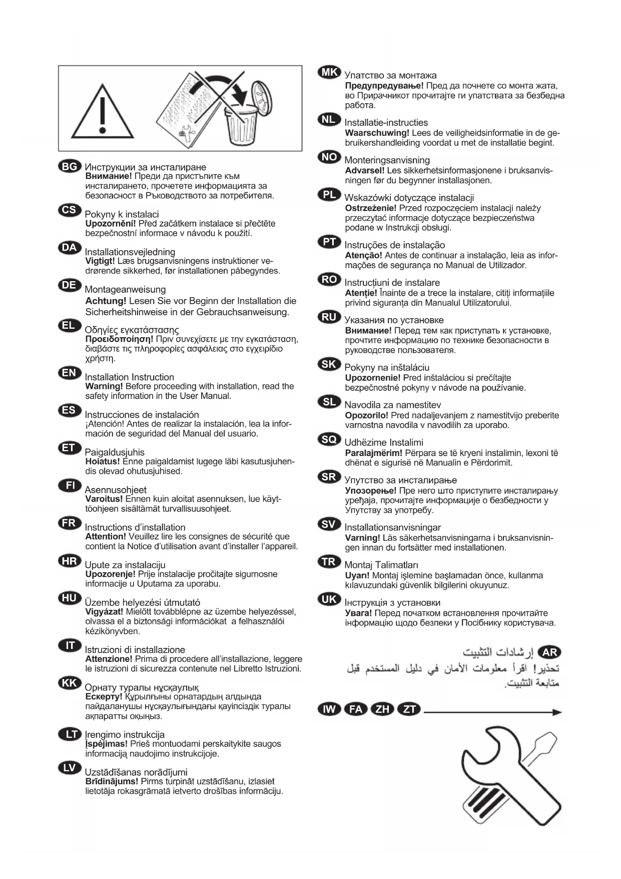 Attention! Veuillez lire les consignes de sécurité que contient la Notice d'utilisation avant d'installer l'appareil.
