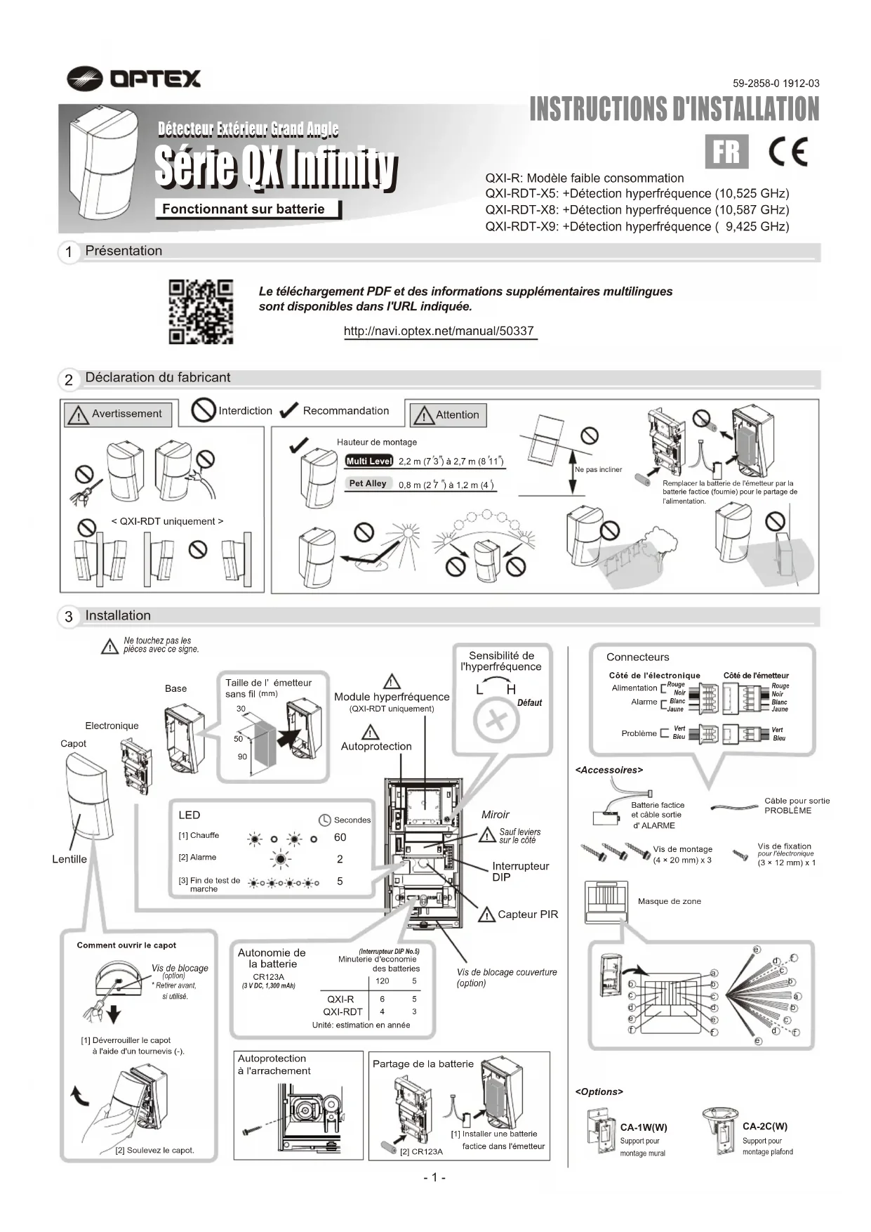 Série QX Infinity Détecteur Extérieur Grand Angle Détecteur Extérieur Grand Angle Série QX Infinity QXI-R: Modèle faible consommationQXI-RDT-X5: +Détection hyperfréquence (10,525 GHz)QXI-RDT-X8: +Détection hyperfréquence (10,587 GHz)QXI-RDT-X9: +Détection hyperfréquence ( 9,425 GHz)Fonctionnant sur batterie Présentationhttp://navi.optex.net/manual/50337 Déclaration du fabricant AvertissementInterdiction Recommandation< QXI-RDT uniquement > Multi Level Pet Alley