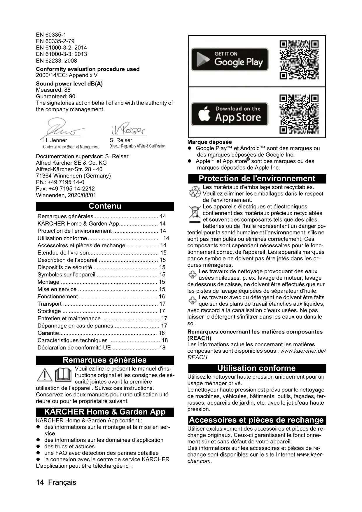 dB(A) 9014 Français EN 60335-1 EN 60335-2-79 EN 61000-3-2: 2014 EN 61000-3-3: 2013 EN 62233: 2008 Conformity evaluation procedure used 2000/14/EC: Appendix V Sound power level dB(A) Measured: 88 Guaranteed: 90 The signatories act on behalf of and with the authority of the company management. Documentation supervisor: S. Reiser Alfred Kärcher SE & Co. KG Alfred-Kärcher-Str. 28 - 40 71364 Winnenden (Germany) Ph.: +49 7195 14-0 Fax: +49 7195 14-2212 Winnenden, 2020/08/01 Contenu Remarques générales Veuillez lire le présent le manuel d'ins- tructions original et les consignes de sé- curité jointes avant la première utilisation de l'appareil. Suivez ces instructions. Conservez les deux manuels pour une utilisation ulté- rieure ou pour le propriétaire suivant. KÄRCHER Home & Garden App KÄRCHER Home & Garden App contient : des informations sur le montage et la mise en ser- vice des informations sur les domaines d’application des trucs et astuces une FAQ avec détection des pannes détaillée la connexion avec le centre de service KÄRCHER L'application peut être téléchargée ici : Marque déposée Google Play™ et Android™ sont des marques ou des marques déposées de Google Inc. Apple