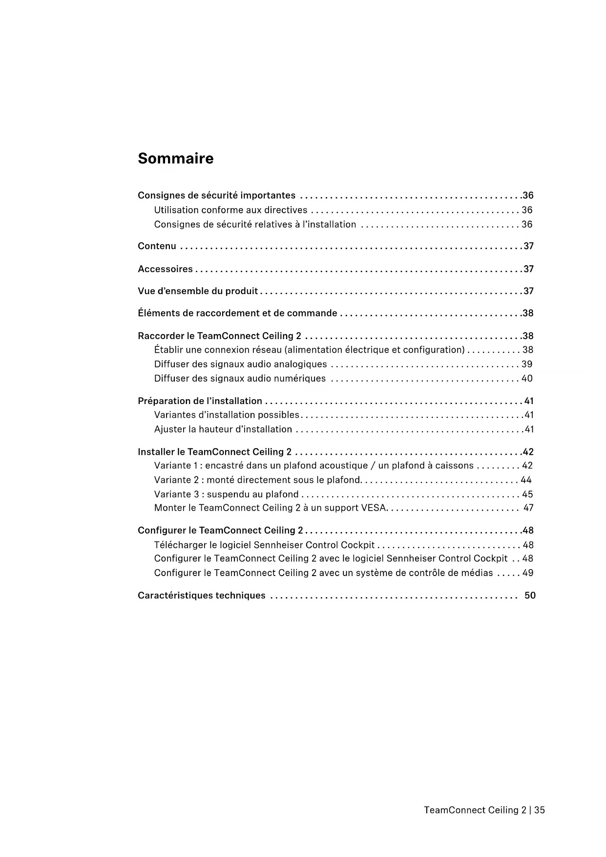 12. Attention : si le niveau du signal est très élevé, vous pouvez endommager votre audition et vos haut-parleurs ! Avant de raccorder le produit, réduisez le volume des appareils de diffusion connectés, en particulier à cause du risque d’effet larsen. Utilisation conforme aux directives Le produit est prévu pour une utilisation en intérieur, tels que, par exemple dans des salles de conférence et des salles de présentation. Le produit peut être utilisé à des fins commerciales. Est considérée comme non conforme aux directives toute utilisation du produit autre que celle décrite dans la notice d’emploi correspondante. Sennheiser décline toute responsabilité en cas de dommage résultant d’une mauvaise utilisation ou d’une utilisation abusive du produit et de ses accessoires. Avant de mettre ce produit en marche, veuillez observer les dispositions légales en vigueur dans votre pays! Consignes de sécurité relatives à l’installation Lors de l’installation, respectez les consignes de sécurité suivantes : f Le montage et toute installation électrique doivent être effectués par un personnel qualifié. f Sur la base de sa formation technique, de son expérience et ses connaissances des dispositions, directives et normes pertinentes, le personnel qualifié doit être capable d’évaluer les tâches assignées, de reconnaître les dangers possib- les et de prendre des mesures de sécurité appropriées. f Lors du montage, observez et suivez les directives et normes locales, nationales et internationales. Cette notice d’emploi est disponible dans d’autres langues sur le site Internet de Sennheiser : www.sennheiser.com/tcc2TeamConnect Ceiling 2 | 37 Contenu Contenu