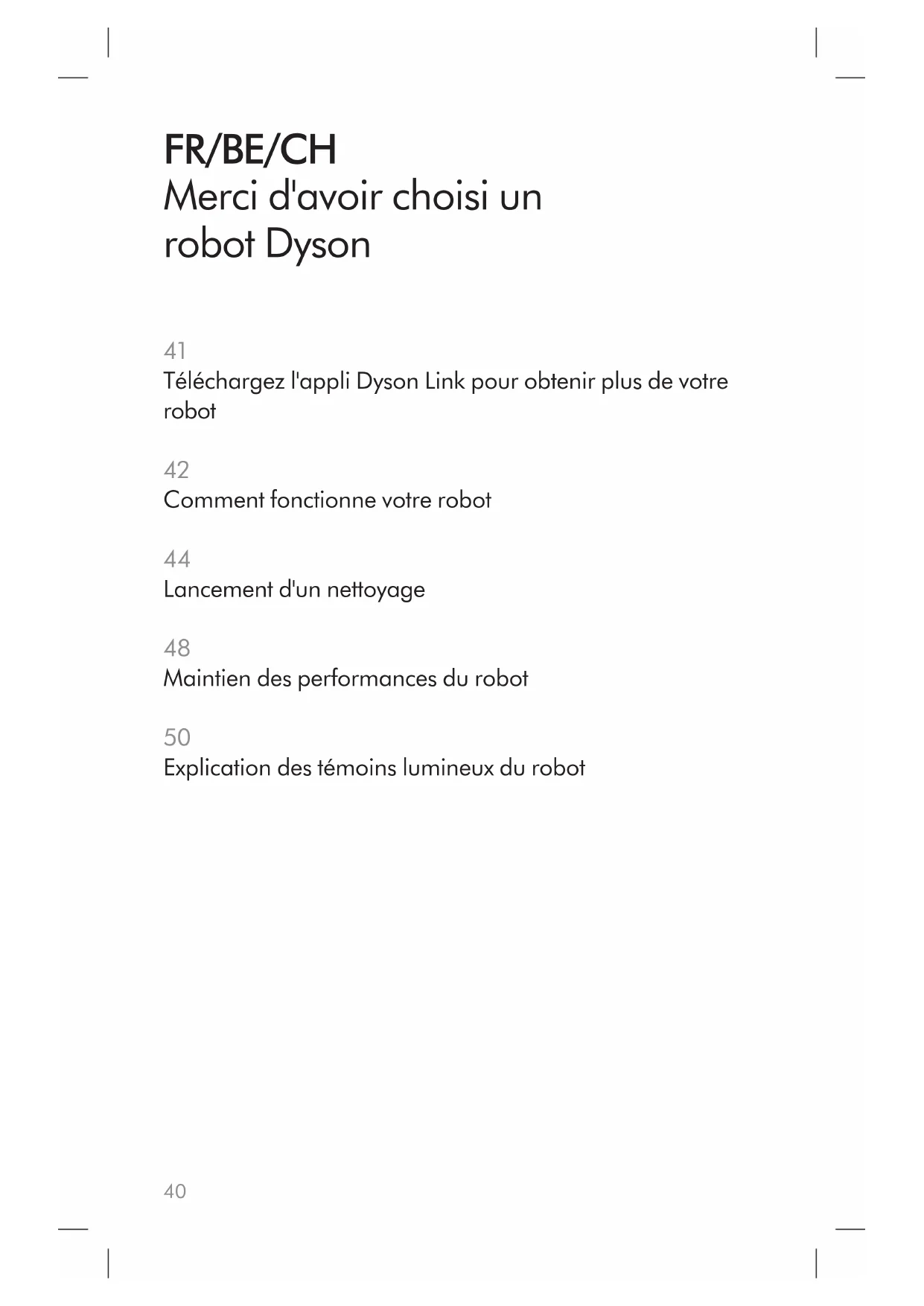 FR/BE/CH Téléchargez l'appli Dyson Link pour obtenir plus de votre robot Comment fonctionne votre robot Lancement d'un nettoyage Maintien des performances du robot Explication des témoins lumineux du robot Merci d'avoir choisi un robot Dyson41 Téléchargez la toute dernière version de l’application DysonLink à partir de la boutique App Store ou Google Play. Ouvrez l'application et suivez les instructions données pour connecter votre robot. Téléchargez l'appli Dyson Link pour obtenir plus de votre robot Personnalisez votre robot. Bénéficiez d’une assistance et d’un paramétrage étape par étape. Choisissez le moment où le robot nettoie. Suivez la progression de nettoyage du robot. Prolongez l'autonomie, augmentez l'aspiration ou réduisez le bruit grâce aux trois niveaux de puissance disponibles. Maintenez votre robot à jour grâce aux mises à jour automatiques du logiciel. Pour plus d’informations et de l’aide En ligne: FR : www.dyson.fr/support BE : www.dyson.be/support CH : www.dyson.ch/support Apple et le logo Apple sont des marques déposées d’Apple Inc., déposées aux États-Unis et dans d’autres pays. App Store est une marque de service d’Apple Inc., déposée aux États-Unis et dans d’autres pays. Google Play et le logo Google Play sont des marques déposées de Google Inc. La marque verbale et les logos Bluetooth