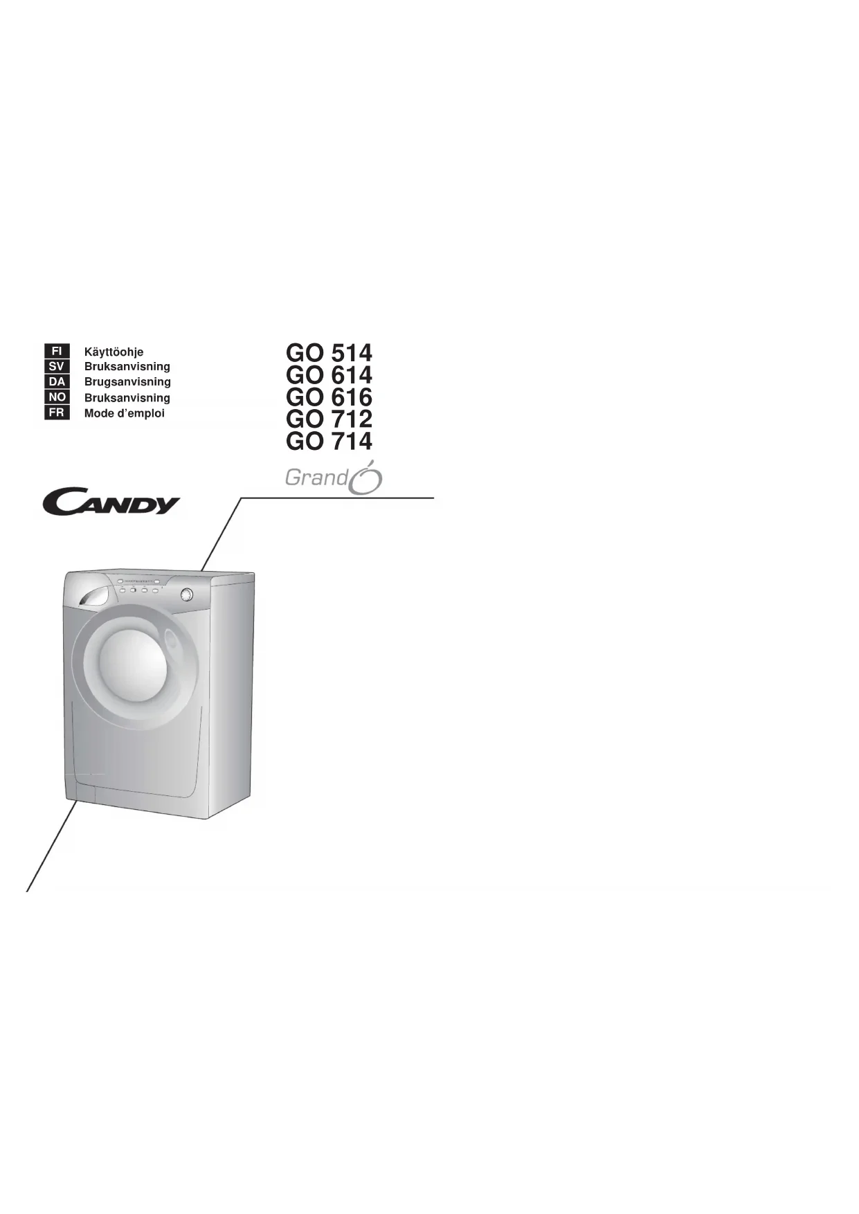 OUS NOS COMPLIMENTS En achetant cet appareil ménager Candy,vous avez démontré que vous n’acceptez aucun compromis: vous voulez toujours ce qu’il y a de mieux. Candy a le plaisir de vous proposer cette nouvelle machine à laver qui est le résultat d’années de recherches et d’études des besoins du consommateur. Vous avez fait le choix de la qualité,de la fiabilité et de l’efficacité. Candy vous propose une large gamme d’appareils électroménagers: machines à laver la vaisselle, machines à laver et sécher le linge, cuisinières, fours à micro- ondes, fours et tables de cuisson,hottes, réfrigerateurs et congélateurs. Demandez à votre Revendeur le catalogue complet des produits Candy. Nous vous prions de lire attentivement les conseils contenus dans ce livret.Il contient d’importantes indications concernant les procédures d’installation, d’emploi,d’entretien et quelques suggestions utiles en vue d’améliorer l’utilisation de la machine à laver. Conservez avec soin ce livret: vous pourrez le consulter bien souvent. Quand vous communiquez avec Candy,ou avec ses centres d’assistance,veuillez citer le Modèle,le n° et le numéro G (éventuellement).KAPPALE AVSNITT KAPITEL KAPITTEL CHAPITRE