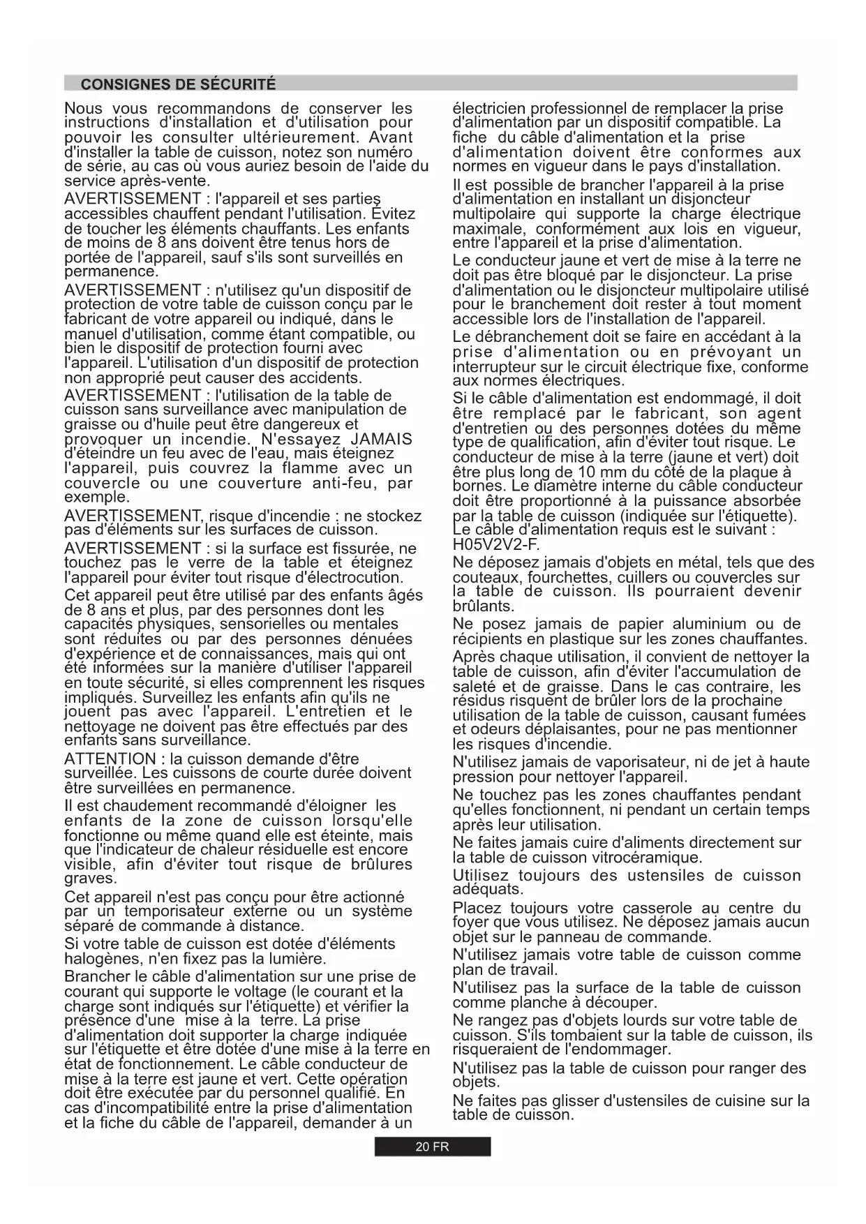 touchez pas le verre de la table et éteignez l'appareil pour éviter tout risque d'électrocution. Cet appareil peut être utilisé par des enfants âgés de 8 ans et plus, par des personnes dont les capacités physiques, sensorielles ou mentales sont réduites ou par des personnes dénuées d'expérience et de connaissances, mais qui ont été informées sur la manière d'utiliser l'appareil en toute sécurité, si elles comprennent les risques impliqués. Surveillez les enfants afin qu'ils ne jouent pas avec l'appareil. L'entretien et le nettoyage ne doivent pas être effectués par des enfants sans surveillance. Nous vous recommandons de conserver les instructions d'installation et d'utilisation pour pouvoir les consulter ultérieurement. Avant d'installer la table de cuisson, notez son numéro de série, au cas où vous auriez besoin de l'aide du service après-vente. AVERTISSEMENT, risque d'incendie : ne stockez pas d'éléments sur les surfaces de cuisson. Cet appareil n'est pas conçu pour être actionné par un temporisateur externe ou un système séparé de commande à distance. Il est chaudement recommandé d'éloigner les enfants de la zone de cuisson lorsqu'elle fonctionne ou même quand elle est éteinte, mais que l'indicateur de chaleur résiduelle est encore visible, afin d'éviter tout risque de brûlures graves.