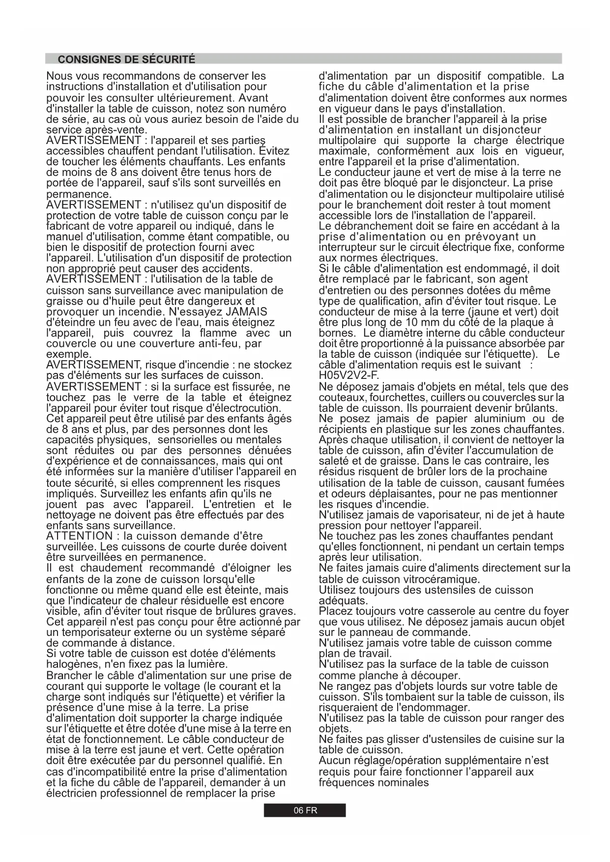 touchez pas le verre de la table et éteignez l'appareil pour éviter tout risque d'électrocution. Cet appareil peut être utilisé par des enfants âgés de 8 ans et plus, par des personnes dont les capacités physiques, sensorielles ou mentales sont réduites ou par des personnes dénuées d'expérience et de connaissances, mais qui ont été informées sur la manière d'utiliser l'appareil en toute sécurité, si elles comprennent les risques impliqués. Surveillez les enfants afin qu'ils ne jouent pas avec l'appareil. L'entretien et le nettoyage ne doivent pas être effectués par des enfants sans surveillance. ATTENTION : la cuisson demande d'être surveillée. Les cuissons de courte durée doivent être surveillées en permanence. Il est chaudement recommandé d'éloigner les enfants de la zone de cuisson lorsqu'elle fonctionne ou même quand elle est éteinte, mais que l'indicateur de chaleur résiduelle est encore visible, afin d'éviter tout risque de brûlures graves. Cet appareil n'est pas conçu pour être actionné par un temporisateur externe ou un système séparé de commande à distance. Si votre table de cuisson est dotée d'éléments halogènes, n'en fixez pas la lumière. Brancher le câble d'alimentation sur une prise de courant qui supporte le voltage (le courant et la charge sont indiqués sur l'étiquette) et vérifier la présence d'une mise à la terre. La prise d'alimentation doit supporter la charge indiquée sur l'étiquette et être dotée d'une mise à la terre en état de fonctionnement. Le câble conducteur de mise à la terre est jaune et vert. Cette opération doit être exécutée par du personnel qualifié. En cas d'incompatibilité entre la prise d'alimentation et la fiche du câble de l'appareil, demander à un électricien professionnel de remplacer la prise