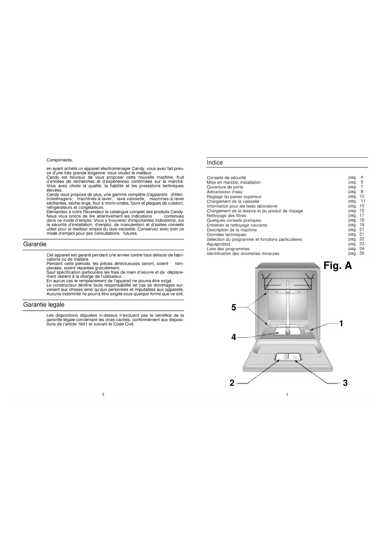 Conseils de sécurité Lire attentivement les instructions contenues dans ce livret car elles donnent d'importantes indications sur la sécurité d'installation, d'utilisation et de maintenance ainsi que quelques conseils utiles pour mieux utiliser le lave-vaisselle. Conserver avec soin ce livret pour toute consultation ultérieure. L'emploi de n'importe quel appareil électrique comporte l'observation de règles fondamentales. En particulier: – Ne pas toucher l'appareil avec les mains ou pieds mouillés ou humides – Ne pas utiliser l'appareil pieds nus – Ne pas tirer sur le câble d'alimentation de l'appareil pour débrancher la prise du courant – Ne pas laisser exposer l'appareil à des agents atmosphériques (pluie, soleil etc...) – Ne pas permettre que l'appareil soit utilisé par des enfants sans surveillance – Le socle ainsi que la prise mâle de l'appareil doivent correspondre à la puissance maximum absorbée par l'appareil. En cas de nécessité de remplacement de l'un ou de l'autre de ces éléments, faire effectuer la modification par un professionel patenté. – S'assurer que l'appareil n'écrase pas le fil électrique d'alimentation – S'il y a une installation d'adoucissement de l'eau dans l'habitation, il n'est pas nécessaire d'ajouter de sel dans l'adoucisseur monté dans le lave-vaisselle – Le lave-vaisselle est conçu pour laver des ustensiles domestiques normaux. Les objets contaminés par de l'essence, de la peinture, des restes d'acier ou de fer, des produits chimiques corrosifs, acides ou alcalins ne doivent pas être lavés en machine – Si l'on veut se débarrasser d'un vieux lave-vaisselle, enlever le système de fermeture de la porte pour que les enfants ne puissent pas s'enfermer dans la machine. – Cet appareil est fabriqué avec des matériaux recyclables pour permettre de les éliminer avec facilité – L'utilisation de prises multiples et/ou rallonges est déconseillée et dégage le constructeur de toutes responsabilités. – Si le remplacement du câble d'alimentation s'avère nécessaire, l'opération doit être réalisée par le Service Après-vente. A la fin du programme de lavage, l’eau résiduelle dans l’appareil ou sur la vaisselle, ne doit pas être consommée. S’appuyer ou s’asseoir sur la porte ouverte du lave vaisselle risque d’entraîner son basculement. La coutellerie est mieux lavée si les manches sont positionnés vers le bas dans le panier à couverts. Attention: Les couteaux et autres ustensiles avec des parties pointues ou coupantes doivent être rangés avec les pointes en bas ou horizontalement. Cet appareil devra être destiné uniquement à l'utilisation à usage domestique. En cas de panne et/ou de mauvais fonctionnement de l'appareil, l'éteindre, fermer le robinet d'arrivée d'eau et ne pas ouvrir l'appareil. Appelez le service après vente de votre revendeur en lui précisant bien le type de votre appareil. Le non respect des prescriptions énoncées ci-dessus peut compromettre la sécurité de l'appareil.7 Installation dans un ensemble de cuisine moderne Juxtaposition Le lave-vaisselle a été étudié avec une hauteur standard de 85 cm et peut être ainsi placé entre des meubles de cuisine moderne d'une même hauteur. Pour obtenir un alignement parfait, agir sur les pieds réglables. Le plan supérieur est un vrai plan de travail en plastique laminé de haute résistance. (Fig. 5). Il est facilement réglable en profondeur jusqu'à 25 mm, en le déplaçant de 5 en 5 mm pour l'aligner sur le plan des meubles adjacents. Pour le réglage, dévisser les 2 vis arrière et fixer le plan dans la position voulue. (Fig. 6). Encastrement (Installation sous un plan de travail) Les ensembles de cuisine moderne ont un plan de travail unique sous lequel viennent s'insérer les meubles de base et les appareils ménagers. Dans ce cas, il suffit de retirer le plan de travail en dévissant les vis qui se trouvent au-dessous et à l'arrière (Fig. 6). La hauteur est ainsi réduite à 82 cm comme prévue dans la norme internationale (ISO), et le lave-vaisselle vient s'intégrer parfaitement sous le plan (Fig. 7). Ouverture de la porte Mettre la main dans le creux, et appuyer vers le haut. Si la porte s'ouvre durant le fonctionnement de l'appareil, une sécurité électrique permet d'interrompre automatiquement les fonctions préétablies. Pour une utilisation correcte ne pas ouvrir la porte du lave-vaisselle pendant son fonctionnement.