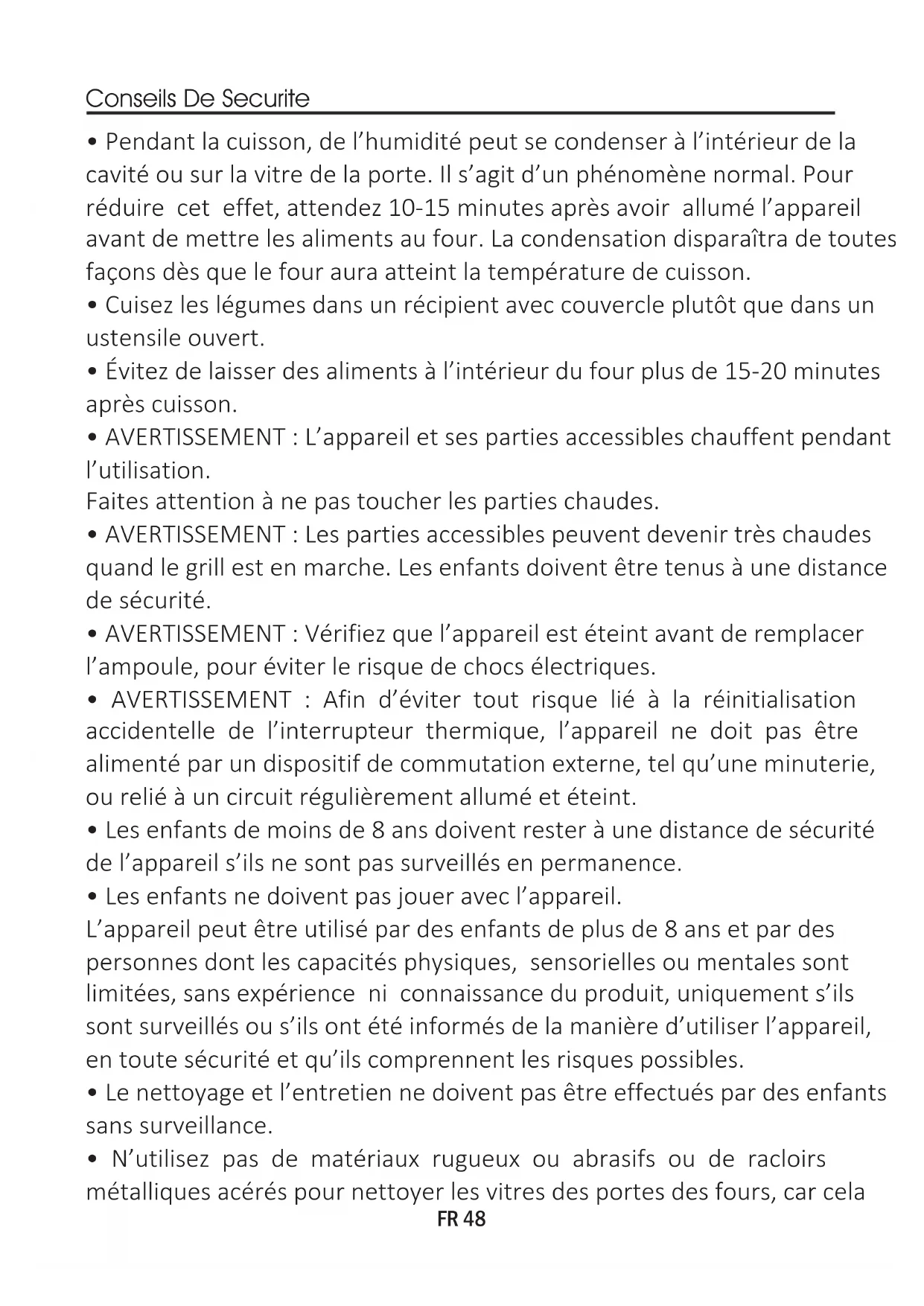 - N’utilisez pas de matériaux rugueux ou abrasifs ou de racloirs métalliques acérés pour nettoyer les vitres des portes des fours, car cela Conseils De SecuriteFR 49 pourrait rayer la surface et provoquer la rupture de la vitre.