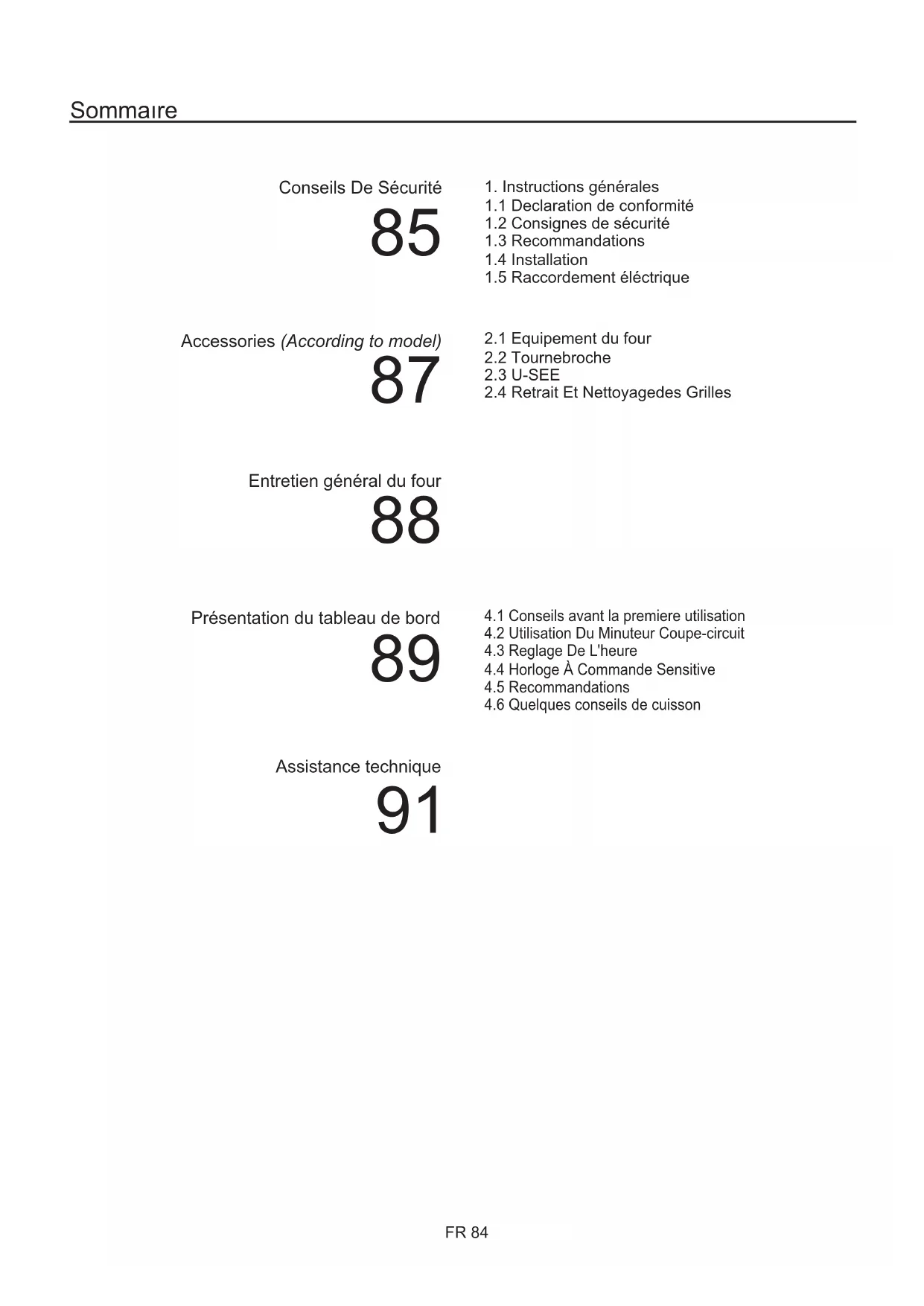 - Vous désactivez la sécurité enfants en pressant la touche pendant au moins 5 secondes. A partir de cet instant, toutes les fonctions sont à nouveau utilisables.•Cette fonction est utilisée pour des cuissons que l'on peut programmer à l'avance. Par exemple, votre plat doit cuire 45 mn et être prêt à 12:30; réglez alors simplement la durée sur 45 mn et l'heure de fin de cuisson sur 12:30.•Quand le temps de cuisson est écoulé, la cuisson s'arrête automati quemen et l'alarme sonne quelques secondes. La cuisson commencera auto- matiquement à 11:45 (12:30 moins 45 mn) et continuera jusqu'à ce que l'heure de fin de cuisson soit atteinte. A ce moment, le tour s'arrêtera automatiq uement. 00:00 select FR 90• LES MODES DE CUISSON- Toutes les cuissons sont réalisées porte fermée - SOLE BRASSEE - Utilisation de la résistance de sole plus la turbine qui brasse l'air dans l'enceinte du four. Cette fonction est idéale pour les tartes à fruits juteux, les tourtes, les quiches, les pâtés. Elle évite le dessèchement des aliments et favorise la levée pour les cuissons de cake, pâte à pain et autres cuissons par le dessous. Placer la grille sur le gradin inférieur. SOLE - Utilisation de la résistance de sole. Idéale pour la cuisson de crème caramel, flans, terrine, cuissons lentes, en cocotte (poulet, boeuf ...). CONVECTION NATURELLE - Utilisation simultanée de la résistance de sole et de voûte. Cette fonction est idéale pour toutes les cuissons à l'ancienne, pour saisir les viandes rouges, les rosbifs, gigots, gibiers, le pain, les papillotes, les feuilletages. CHALEUR BRASSEE - Utilisation simultanée de la résistance de sole, de voûte, et de la turbine qui brasse l'air dans l'enceinte du four. Cette fonction est recommandée pour les volailles, les pâtisseries, les poissons, les légumes.... La chaleur pénètre mieux à l'intérieur du mets à cuire et réduit le temps de cuisson. Vous pouvez réaliser des cuissons combinées avec préparations identiques ou non sur un ou deux gradins. Ce mode de cuisson assure en effet une répartition homogène de la chaleur et ne mélange pas les odeurs. Prévoir une dizaine de minutes de plus, pour la cuisson combinée. ÉLÉMENT DE CHAUFFAGE CIRCULAIR + BRASSÉE - Utilisation simultanée de la résistance circulaire et de la turbine qui brasse l'air dans l'enceinte du four. La définition de cette fonction est équivalente à celle de la chaleur brassée. GRIL - Utilisation de la résistance de voûte uniquement. Un préchauffage de 5 minutes est nécessaire pour le rougissement de la résistance. C'est le succès assuré pour les grillades, les brochettes et pour les gratins.Les viandes blanches doivent être écartées du grilloir ; le temps de cuisson sera alors plus long,mais la viande sera plus savoureuse. Pour les viandes rouges et filets de poissons, ils peuvent être placés sur la grille avec le plat récolte sauce glissé dessous. Le récolte-sauce peut également être positionné sur une grille située sur le gradin inférieur. TURBO GRIL - Utilisation de la résistance de voûte plus la turbine qui brasse l'air dans l'enceinte du four. Un préchauffage est nécessaire pour les viandes rouges et inutile pour les viandes blanches. Idéal pour les cuissons de volume épais, de pièce entière telles que rôti de porc, volailles etc... Placer le mets à cuire directement sur la grille au centre du four, à un niveau moyen. Glisser le récolte-sauce sous la grille de façon à récupérer les graisses. S'assurer que le mets ne soit pas trop près du grilloir. Retourner la pièce à cuire à mi-cuisson. TOURNEBROCHE VENTILE - Utilisation de la résistance de voûte, de la turbine, et du tournebroche qui permet la rotation du mets à cuire.Le tournebroche est temporisé en mode programmation c'est-à-dire il continue de tourner cinq minutes après la fin de cuisson pour répartir les derniers rayonnements résiduels. Idéal pour retrouver toutes les saveurs de la rôtisserie à l'ancienne. On ne fait pas de préchauffage pour les cuissons au tournebroche. DECONGELATION - Fonctionnement de la turbine de cuisson qui brasse l’air dans l’enceinte du four. Idéale pour réaliser une décongélation avant une cuisson.La température est pré-réglée à 40°C constants, aucun réglage n'est possible. LE MODE ETUVE - Utilisation simultanée de la résistance de voûte et de sole plus la turbine qui brasse l'air dans l'enceinte du four. Idéal pour maintenir un plat au chaud sans risque de surcuisson et pratique aussi pour chauffer les assiettes vides.La température est pré-réglée à 60°C constants aucun réglage n'est possible. PIZZA - La forte chaleur produite par la fonction Pizza est très proche de celle d’un feu de bois dans un four traditionnel.