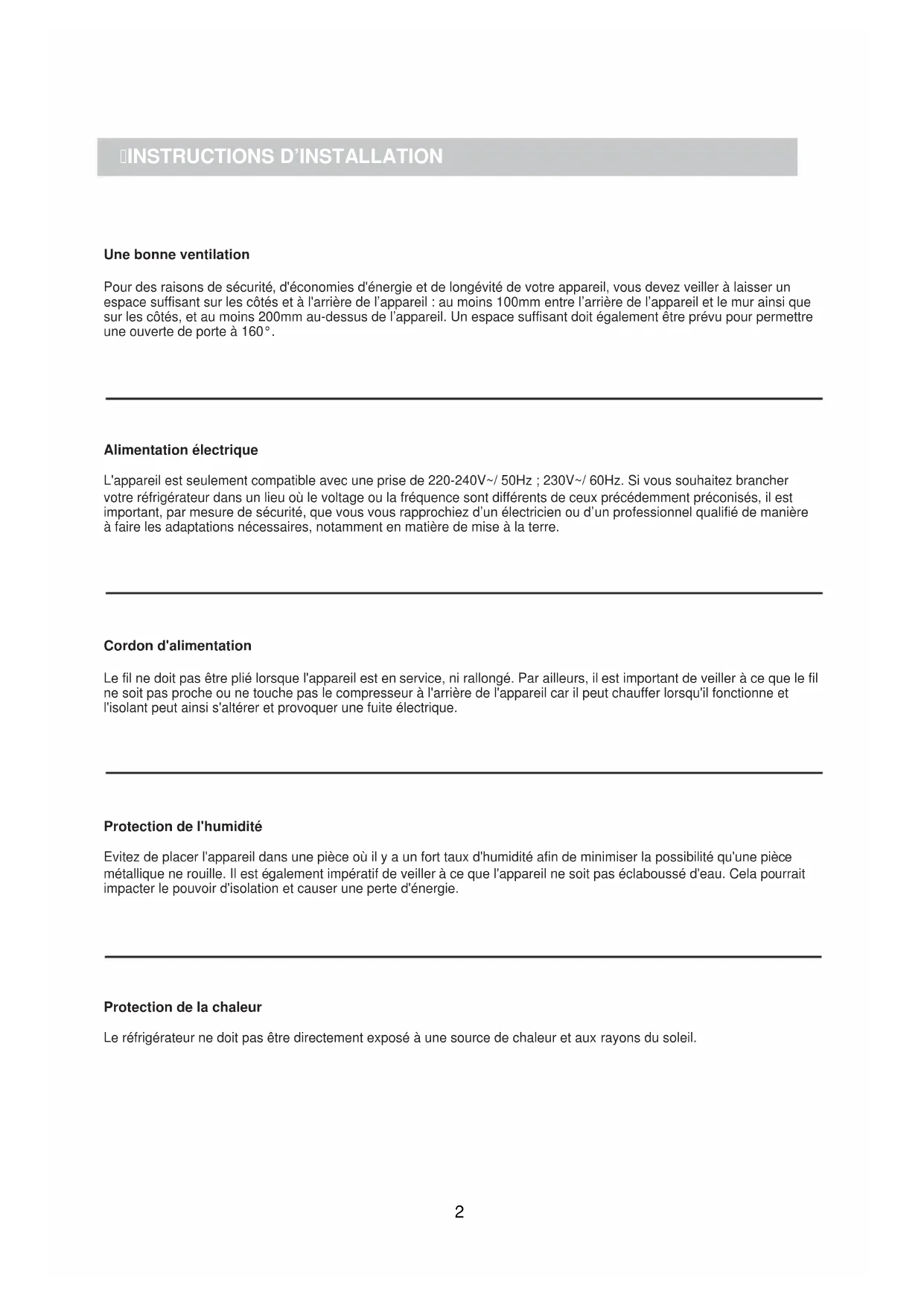 Alimentation électrique L'appareil est seulement compatible avec une prise de 220-240V~/ 50Hz ; 230V~/ 60Hz. Si vous souhaitez brancher votre réfrigérateur dans un lieu où le voltage ou la fréquence sont différents de ceux précédemment préconisés, il est important, par mesure de sécurité, que vous vous rapprochiez d’un électricien ou d’un professionnel qualifié de manière à faire les adaptations nécessaires, notamment en matière de mise à la terre.