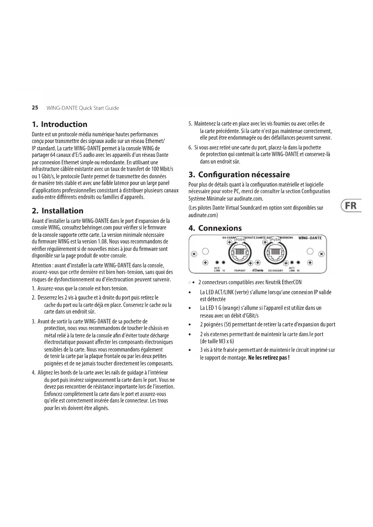 Avant d’installer la carte WING-DANTE dans le port d’expansion de la console WING, consultez behringer.com pour vérier si le rmware de la console supporte cette carte. La version minimale nécessaire du rmware WING est la version 1.08. Nous vous recommandons de vérier régulièrement si de nouvelles mises à jour du rmware sont disponible sur la page produit de votre console. Attention : avant d’installer la carte WING-DANTE dans la console, assurez-vous que cette dernière est bien hors-tension, sans quoi des risques de dysfonctionnement ou d’électrocution peuvent survenir.