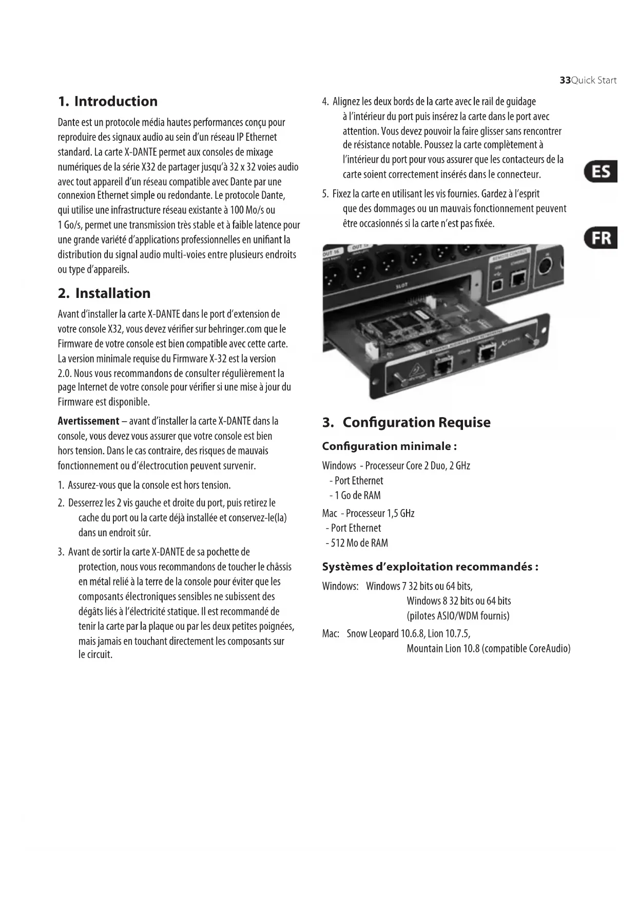 Avant d’installer la carte X-DANTE dans le port d’extension de votre console X32, vous devez vérier sur behringer.com que le Firmware de votre console est bien compatible avec cette carte. La version minimale requise du Firmware X-32 est la version 2.0. Nous vous recommandons de consulter régulièrement la page Internet de votre console pour vérier si une mise à jour du Firmware est disponible. Avertissement – avant d’installer la carte X-DANTE dans la console, vous devez vous assurer que votre console est bien hors tension. Dans le cas contraire, des risques de mauvais fonctionnement ou d’électrocution peuvent survenir.
