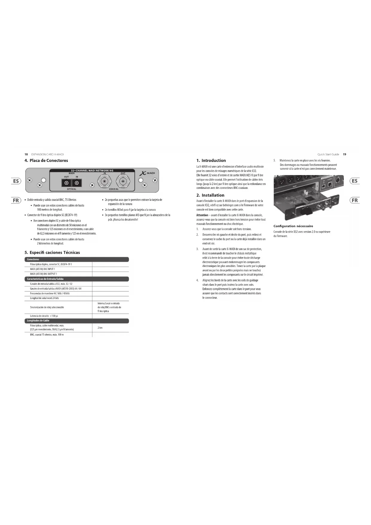 Desdommages ou mauvais fonctionnements peuvent survenir si la carte n’est pas correctement maintenue. Con guration nécessaire Console de la série X32 avec version 2.0 ou supérieure duFirmware. 18 19Quick Start GuideEXPANSION CARD X-MADI3. Con guration X32
