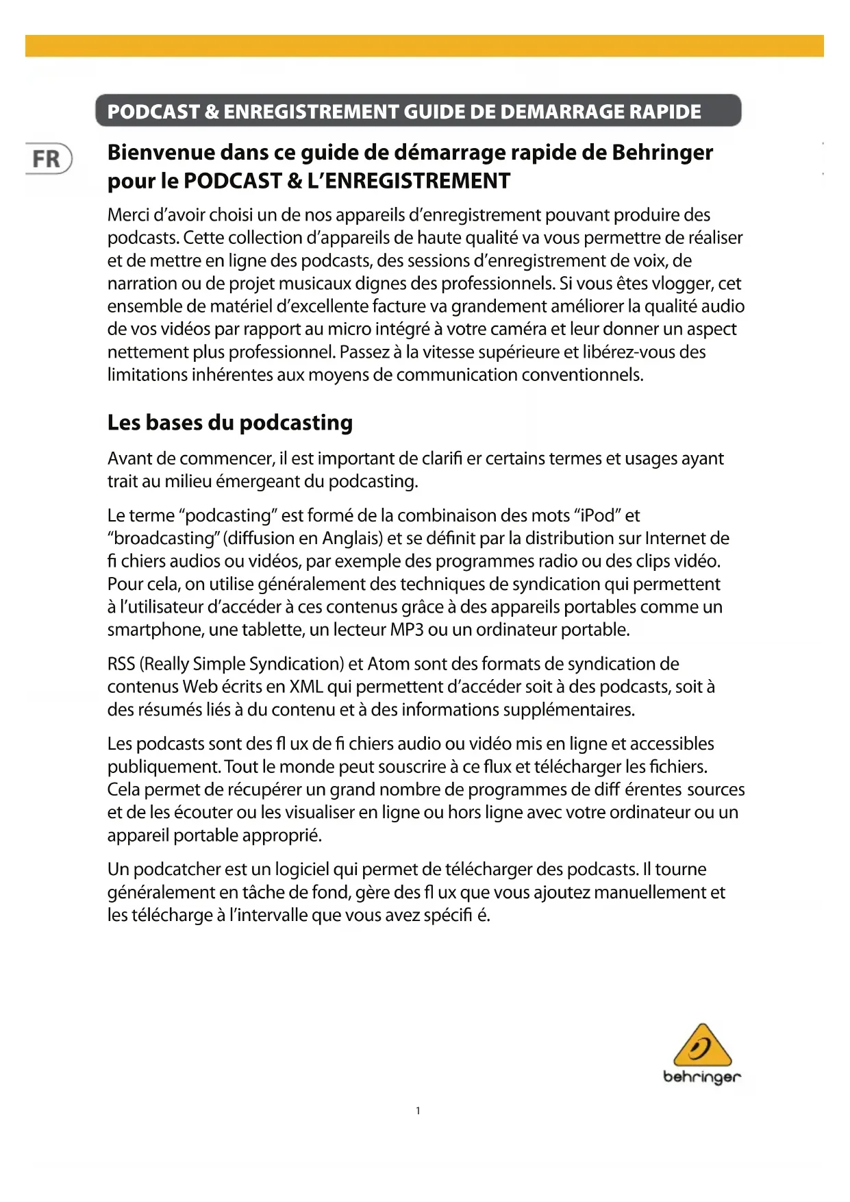 Bienvenue dans ce guide de démarrage rapide de Behringer pour le PODCAST & L’ENREGISTREMENT Merci d’avoir choisi un de nos appareils d’enregistrement pouvant produire des podcasts. Cette collection d’appareils de haute qualité va vous permettre de réaliser et de mettre en ligne des podcasts, des sessions d’enregistrement de voix, de narration ou de projet musicaux dignes des professionnels. Si vous êtes vlogger, cet ensemble de matériel d’excellente facture va grandement améliorer la qualité audio de vos vidéos par rapport au micro intégré à votre caméra et leur donner un aspect nettement plus professionnel. Passez à la vitesse supérieure et libérez-vous des limitations inhérentes aux moyens de communication conventionnels. Les bases du podcasting Avant de commencer, il est important de clari er certains termes et usages ayant trait au milieu émergeant du podcasting. Le terme “podcasting” est formé de la combinaison des mots “iPod” et “broadcasting” (di usion en Anglais) et se dé nit par la distribution sur Internet de chiers audios ou vidéos, par exemple des programmes radio ou des clips vidéo. Pour cela, on utilise généralement des techniques de syndication qui permettent à l’utilisateur d’accéder à ces contenus grâce à des appareils portables comme un smartphone, une tablette, un lecteur MP3 ou un ordinateur portable. RSS (Really Simple Syndication) et Atom sont des formats de syndication de contenus Web écrits en XML qui permettent d’accéder soit à des podcasts, soit à des résumés liés à du contenu et à des informations supplémentaires. Les podcasts sont des ux de chiers audio ou vidéo mis en ligne et accessibles publiquement. Tout le monde peut souscrire à ce ux et télécharger les chiers. Cela permet de récupérer un grand nombre de programmes de di érentes sources et de les écouter ou les visualiser en ligne ou hors ligne avec votre ordinateur ou un appareil portable approprié. Un podcatcher est un logiciel qui permet de télécharger des podcasts. Il tourne généralement en tâche de fond, gère des ux que vous ajoutez manuellement et les télécharge à l’intervalle que vous avez spéci é.PODCAST & ENREGISTREMENT GUIDE DE DEMARRAGE RAPIDE