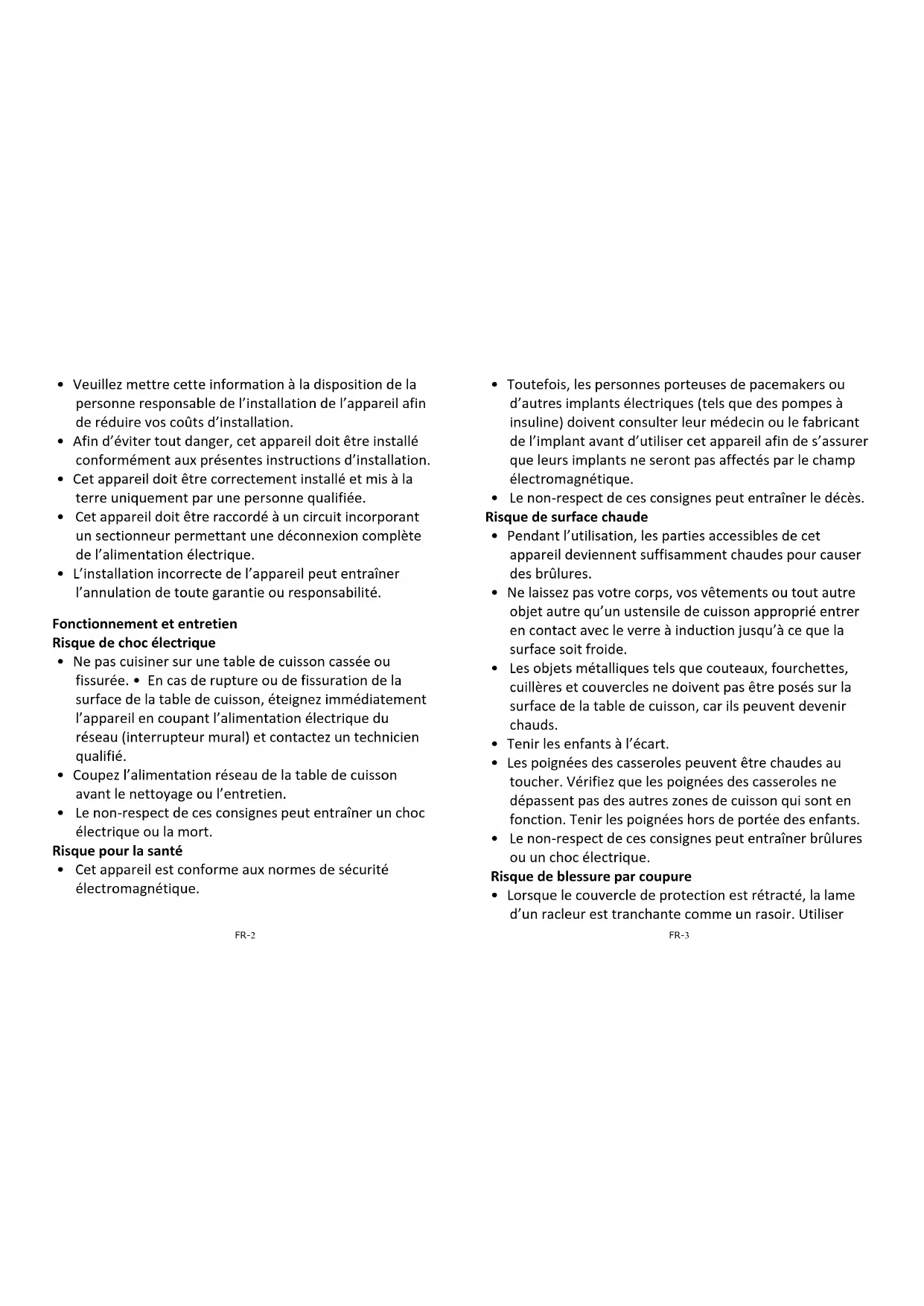 - Aucun matériau ou produit combustible ne doit être placé sur cet appareil à aucun moment. Consignes de sécurité Votre sécurité est importante pour nous. Veuillez lire ces informations avant d’utiliser votre table de cuisson. Installation Risque de choc électriqueFR-2