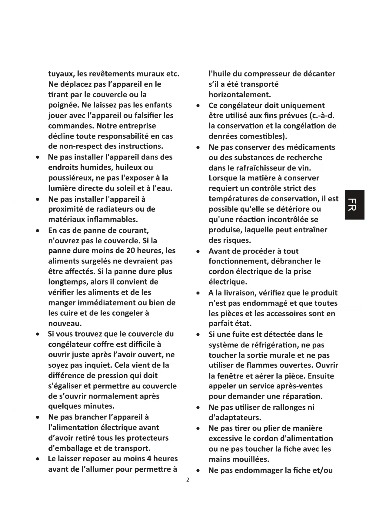 - En cas de panne de courant, n'ouvrez pas le couvercle. Si la panne dure moins de 20 heures, les aliments surgelés ne devraient pas être affectés. Si la panne dure plus longtemps, alors il convient de vérifier les aliments et de les manger immédiatement ou bien de les cuire et de les congeler à nouveau.