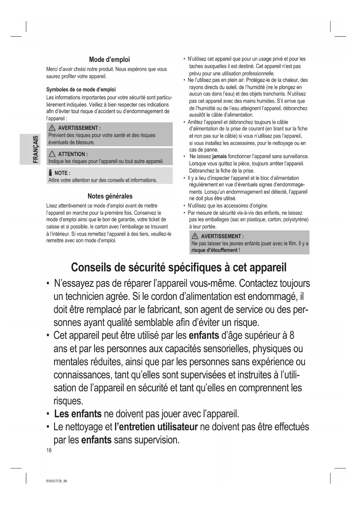 - Le nettoyage et l’entretien utilisateur ne doivent pas être effectués par les enfants sans supervision.17 BS9027CB_IM 08.03.16