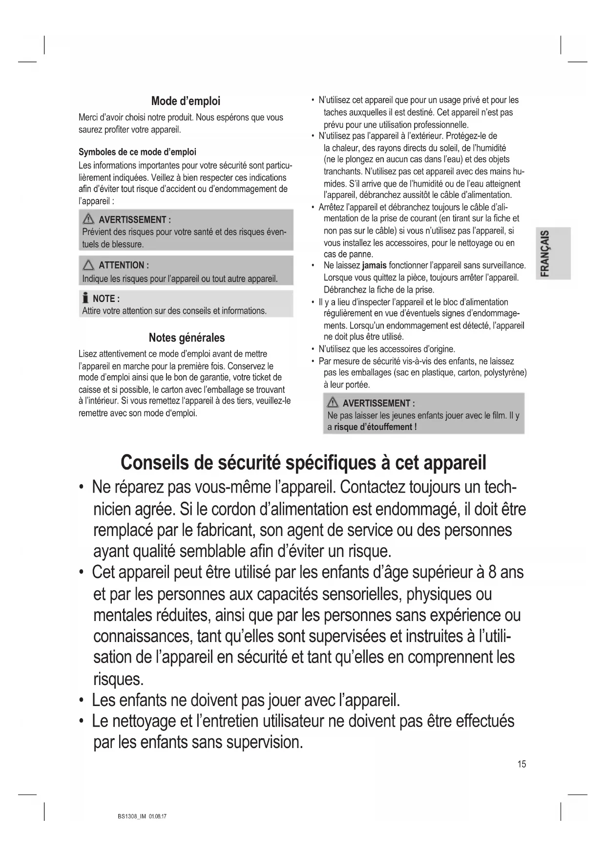 - Le nettoyage et l’entretien utilisateur ne doivent pas être effectués par les enfants sans supervision.16 BS1308_IM 01.08.17