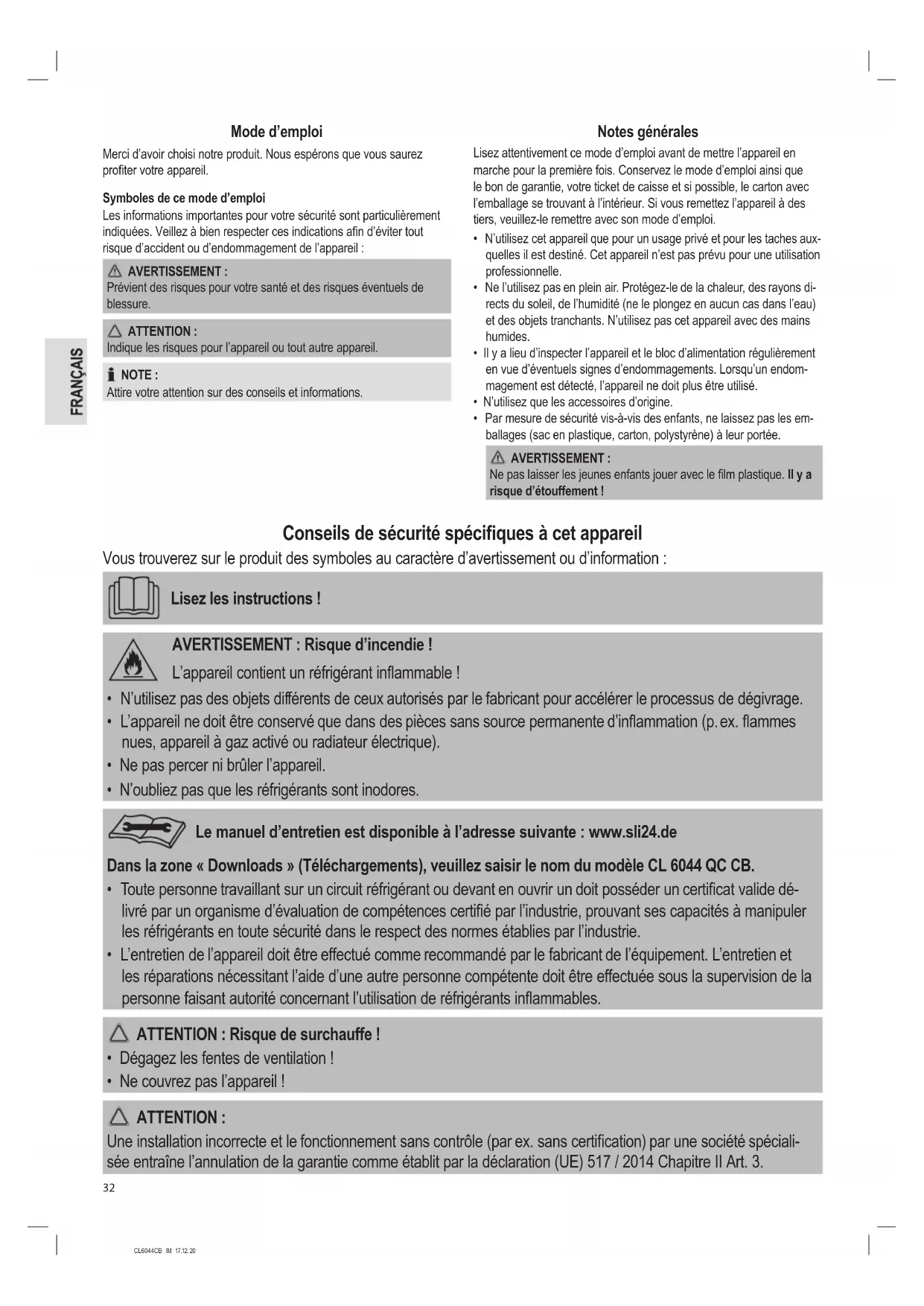 - N’oubliez pas que les réfrigérants sont inodores. Le manuel d’entretien est disponible à l’adresse suivante : www.sli24.de Dans la zone « Downloads » (Téléchargements), veuillez saisir le nom du modèle CL 6044 QC CB.