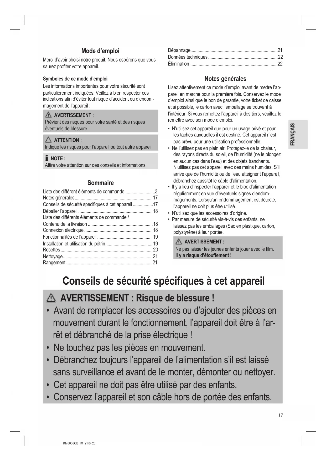 Données techniques Modèle : .............................................................KM 6036 CB Alimentation : .....................................220 - 240 V~, 50 / 60 Hz Consommation : .......................................................... 1500 W Classe de protection : .......................................................... Poids net : ............................................................env. 6,35 kg Nous nous réservons le droit d’apporter des modications techniques ainsi que des modications de conception dans le cadre du développement continu de nos produits. Cet appareil a été contrôlé d’après toutes les directives européennes actuelles applicables, comme par exemple concernant la compatibilité électromagnétique et la basse tension. Cet appareil a été fabriqué en respect des régle- mentations techniques de sécurité les plus récentes. Élimination Signication du symbole « Poubelle » Protégez votre environnement, ne jetez pas vos appareils électriques avec les ordures mé- nagères. Utilisez, pour l’élimination de vos appareils électriques, les bornes de collecte prévues à cet effet où vous pouvez vous débarrasser des appareils que vous n’utilisez plus. Vous contribuez ainsi à éviter les impacts potentiels dans l’environnement et sur la santé de chacun, causés par une mauvaise élimination de ces déchets. Vous contribuez aussi au recyclage sous toutes ses formes des appareils électriques et électroniques usagés. Vous trouverez toutes les informations sur les bornes d’élimination des appareils auprès de votre commune ou de l’administration de votre communauté.KM6036CB_IM 21.04.20