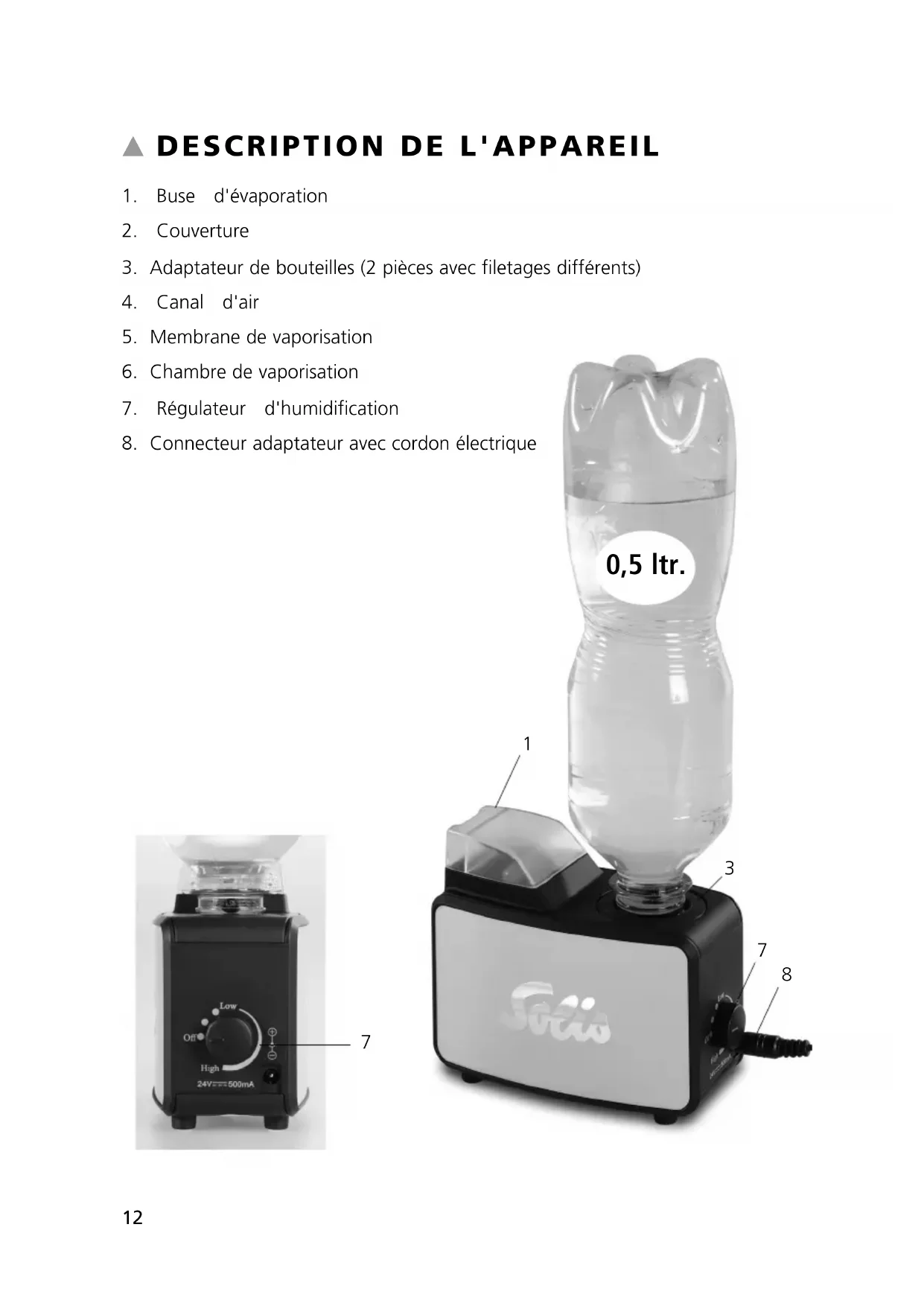 - Si l'eau du robinet est très dure, du calcaire peut s'incruster. Dans ce cas, nous vous conseillons: – de détartrer l'humidificateur avec le produit SOLIPOL, – de vider la bouteille et la chambre de vaporisation après chaque usage et de les remplir à nouveau avec de l'eau fraîche avant chaque mise en service.